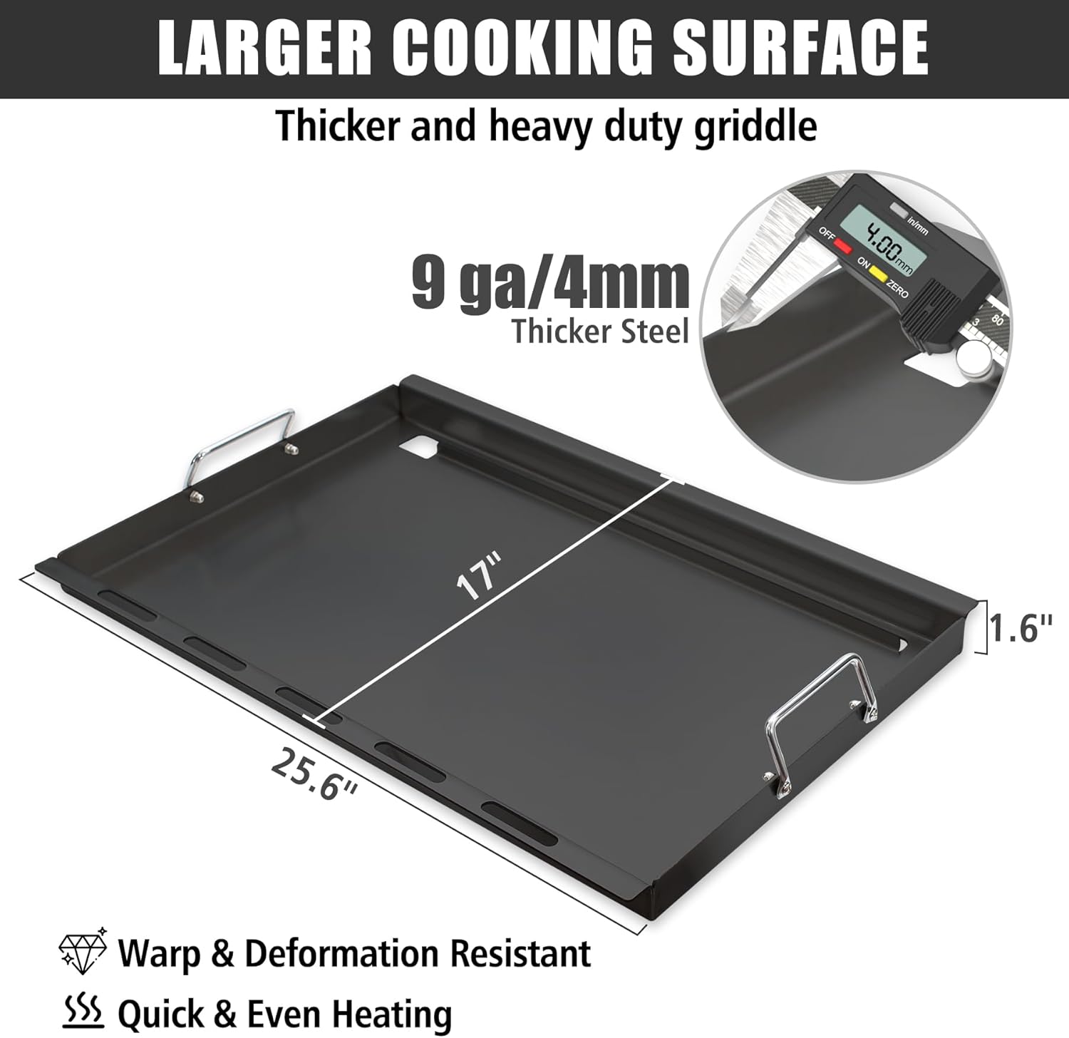 - Premium Quality Construction: Crafted from high-quality carbon steel, our griddle insert is nonstick, durable, and heats up faster than traditional griddles. 4mm thickness ensures even heat distribution for perfectly cooked meals every time.
