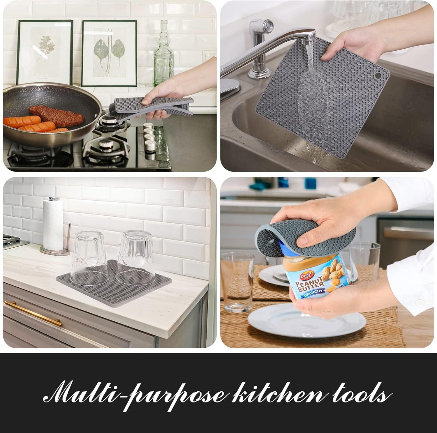 - MULTI-PURPOSE KITCHEN TOOLS - Each trivet has a corner hole for convenient hanging storage and can be used as a coaster, drying mat, jar opener gripper pad, spoon holder, garlic peeler, and potholder mat.