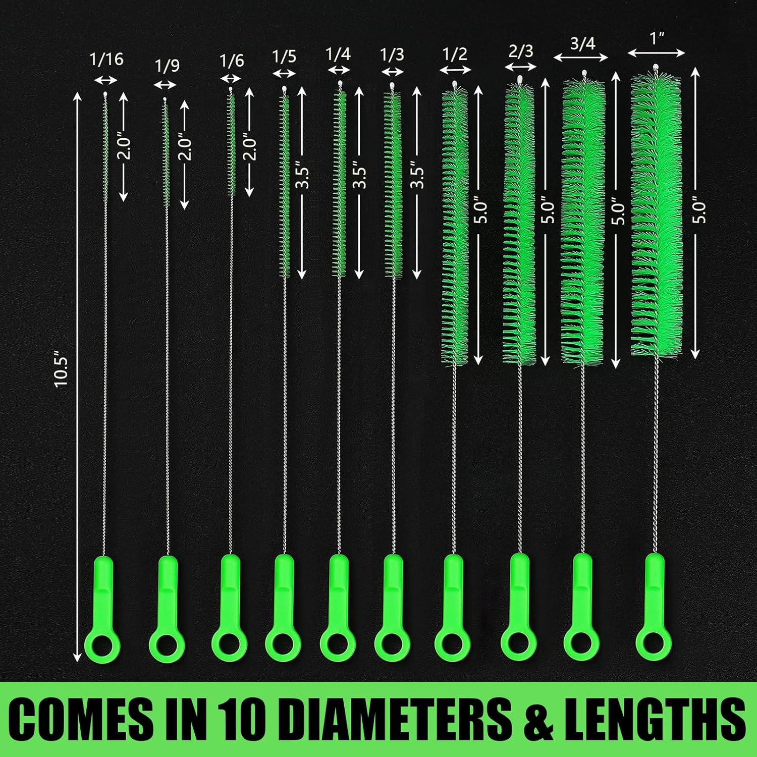 - 🐼✔️10 DIFFERENT SIZE TUBE CLEANING BOTTLE BRUSHES: Each Set Of 10 Different Sized Straw Cleaning Brushes are Organized On A Keychain. Not Only Does It Keep Them All Together But It Makes It A Lot Easier To Find The Size That’s Right For The Job while you are gathering your house cleaning supplies. Each Tube Wire Brush Is A Full 10.5” In Length And Each Comes In A Different Diameter. These Diameters respectively(1/16”, 1/9”, 1/6”, 1/5”, 1/4”, 1/3”, 1/2”, 2/3”, 3/4”, and 1inch)