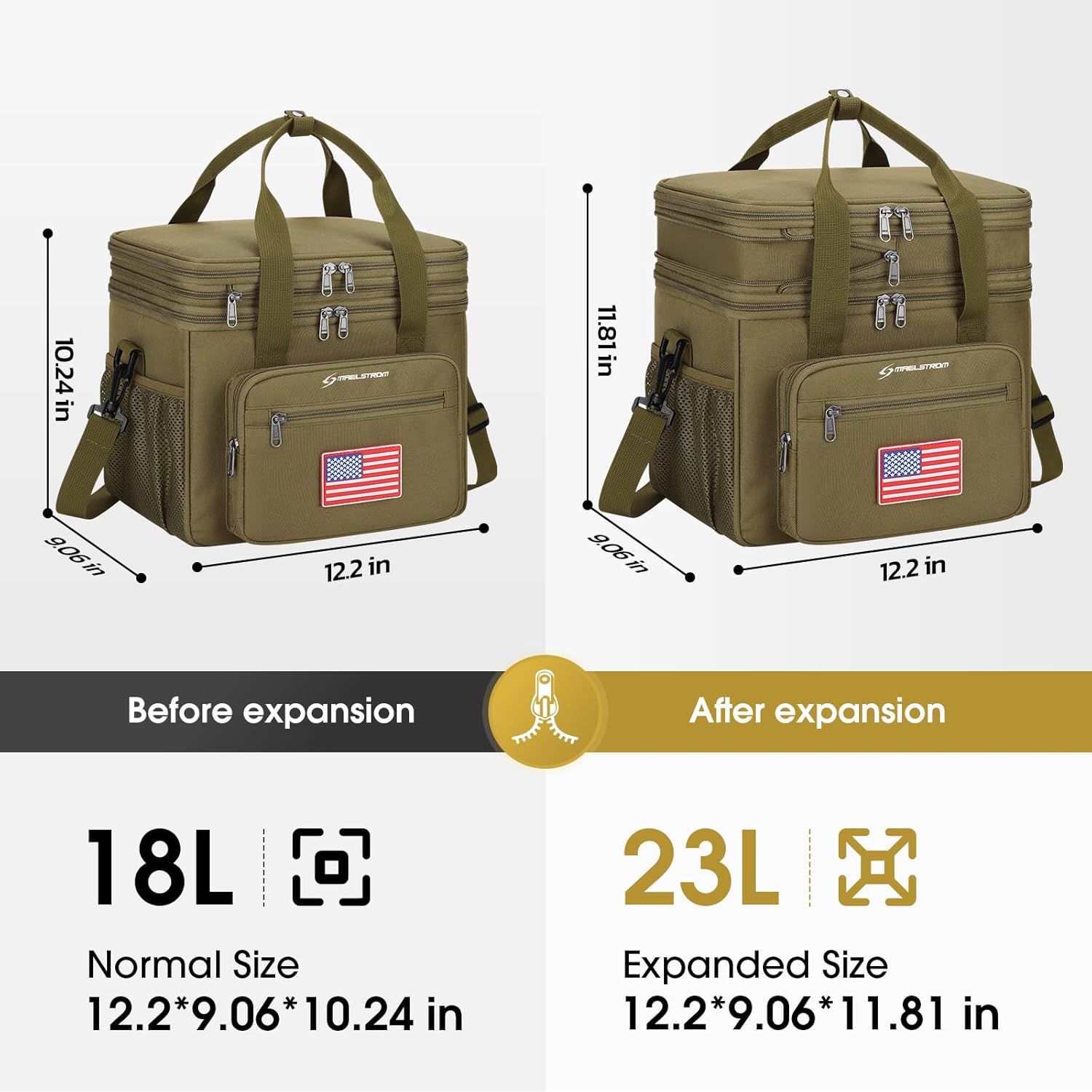 - Expandable & Foldable: With a reinforced zipper, top compartment of Maelstrom expandable lunch box can be easily expanded with a simple zipper action.The original measure is 12.6*9.8*9.8 inch (L*W*H). And the expandable measure could be 12.6*9.8*11.8 inch (L*W*H),storing 23L.The main compartment can store drinks, beer, fruits, ice packs, etc., and you can expand the upper layer to place some snack to meet your different lunch meal needs.