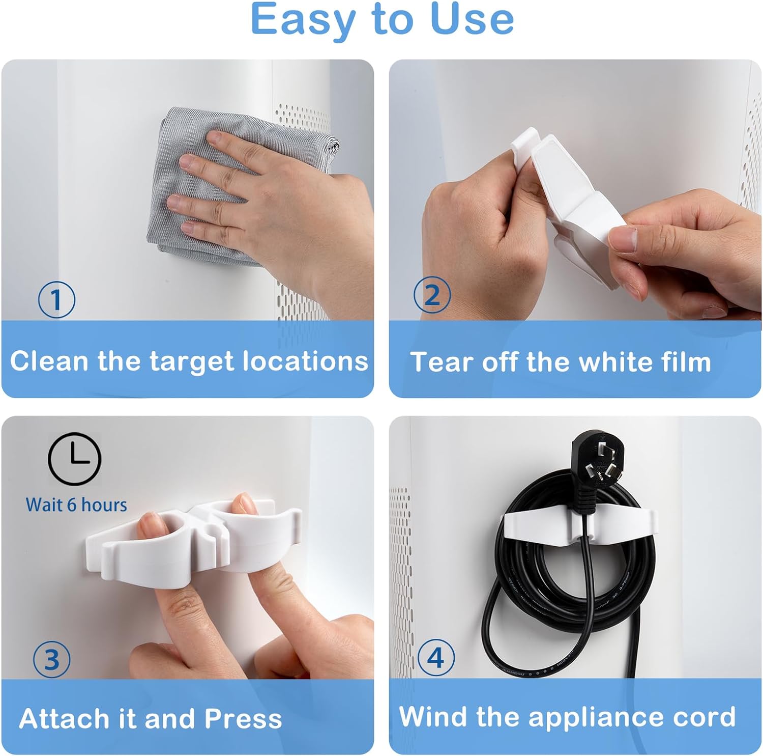 - Easy Installation: The cord holder is an essential kitchen aid that can be easily attached to a variety of surfaces. In order to fix the cord keeper for appliances more firmly, please clean the surface of the appliance before attaching the appliance cord organizer and allow at least 6 hours for the adhesive to set before wrapping the wires, this will make cable holder firmer and last longer.