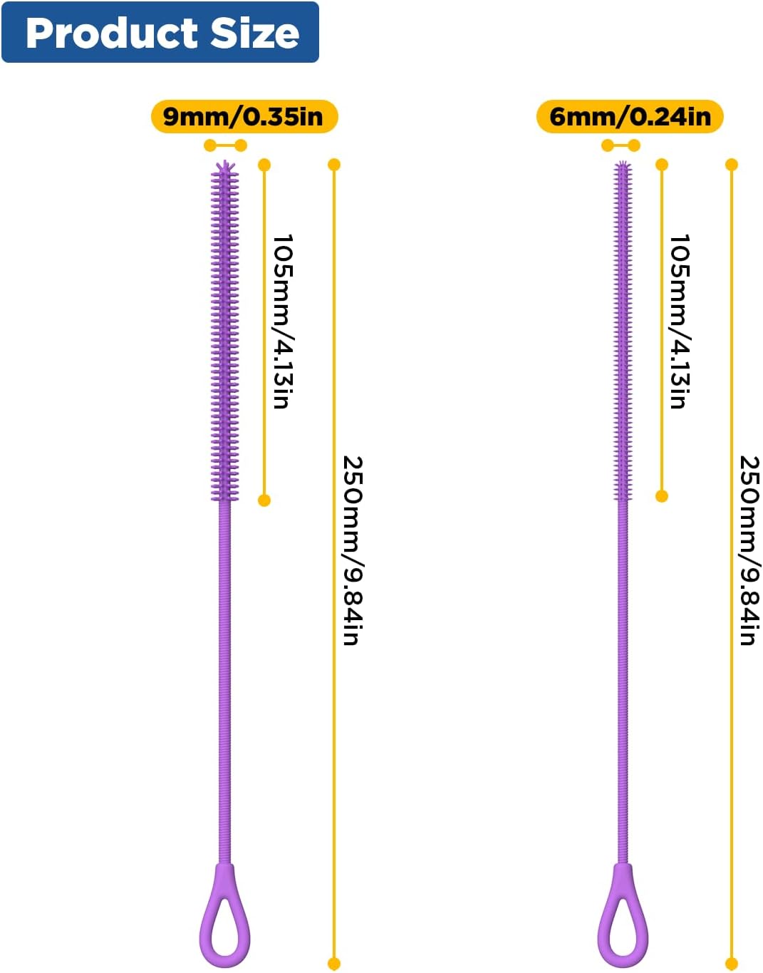 - >Multi Size: The set includes two diameters silicone straw brush, the length is 250mm, the diameters are 6mm and 9mm, and the brush head part is lengthened to 100mm, due to its extra long and soft design, it can easily brush the bottom of all kinds of straws, and it can clean every part of the straws to achieve a thorough cleaning effect.