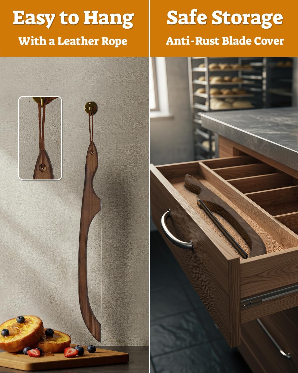 - Sharp Blade with Serrated Saw: The bread baking supplies feature an exceptionally sharp serrated blade that effortlessly slice through all types of bread. The bread cutter for homemade bread saw-like edges ensure clean, precise cuts without tearing or crushing, making it perfect for crusty loaves and soft pastries alike. For added safety, the bread slicer for sourdough rounds comes with a protective sheath to prevent accidental cuts when stored