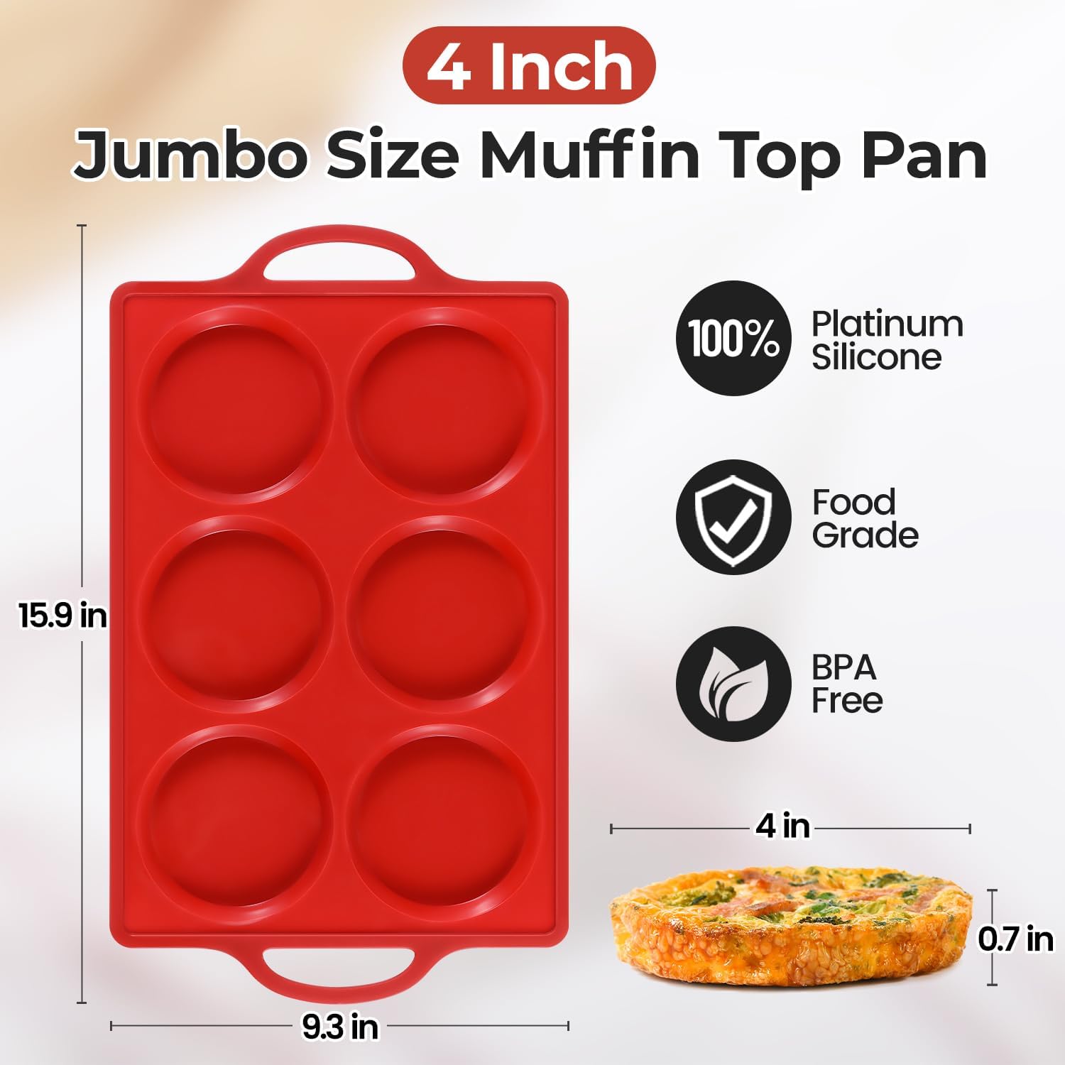 CAKETIME Silicone Muffin Top Pan with Metal Frame, 4 Inch Jumbo Non Stick Round Egg Baking Pan for Oven English Muffins, Whoopie Pies, Corn Bread, Egg Bites, Breakfast Sandwiches Tarts 2 Pack Red