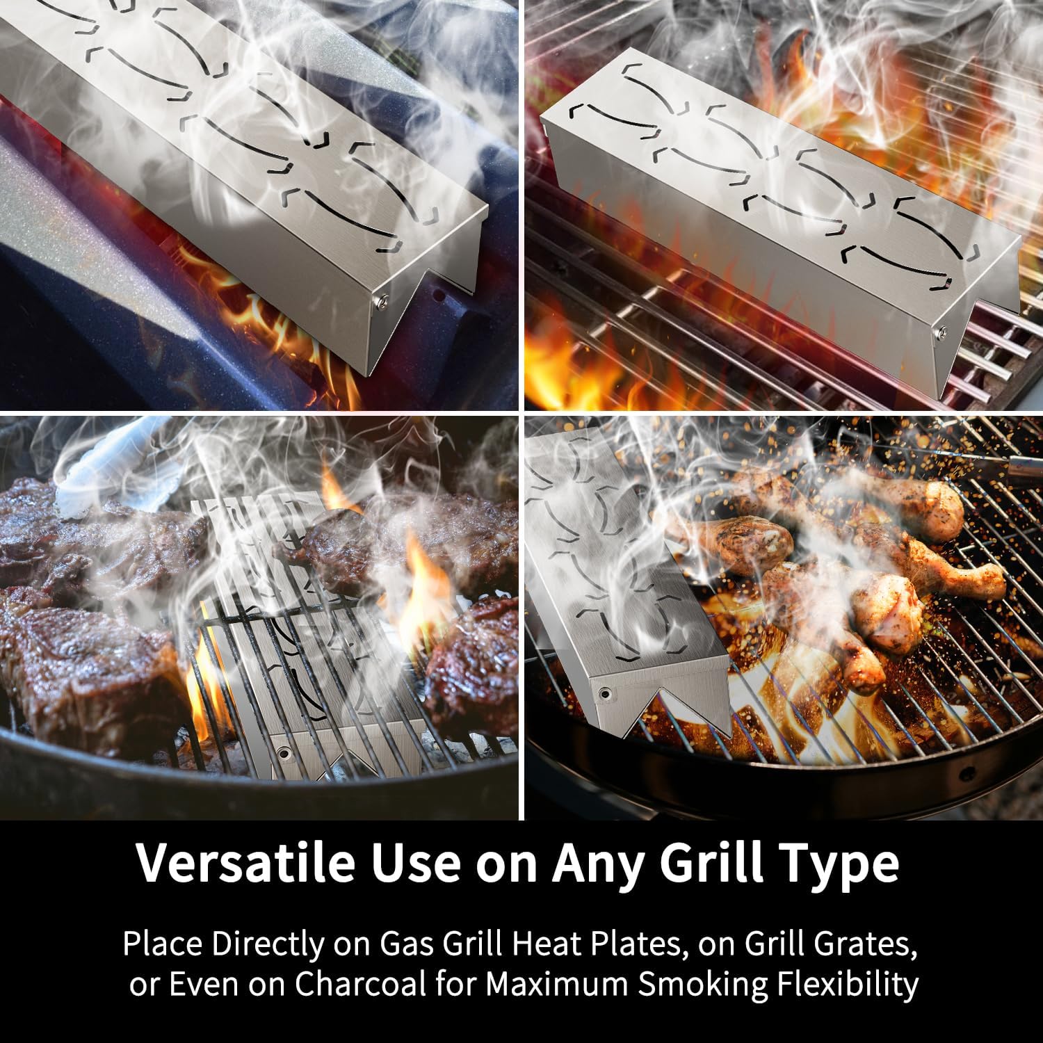 - Unique V-Shaped Design: This smoke box for gas grill features a unique V-shaped design that fits securely on most heat plates, ensuring stability on popular grill brands like Weber, Char-Broil, Nexgrill, and more. This versatile design allows you to place it on heat plates, grill grates, or directly on charcoal, making it a perfect addition to your charcoal grill accessory collection