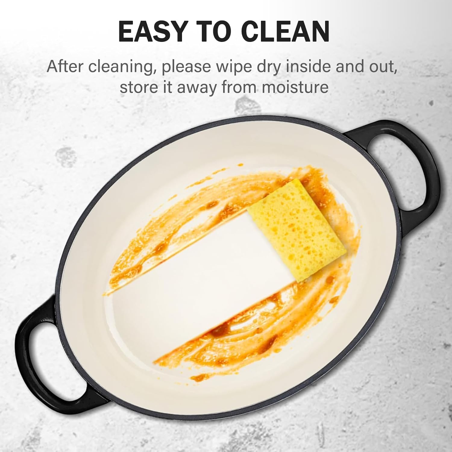 - Easy to clean: The outer layer of this oval ceramic coated cast iron pot is a non adhesive coating that minimizes sticking and makes it easy to clean with a soft sponge or cloth. If you want to remove stains that are difficult to remove, you can soak the non-stick emaneled dutch oven pot in warm water for 1 to 2 hours or more, and then use baking soda or neutral detergent to remove them