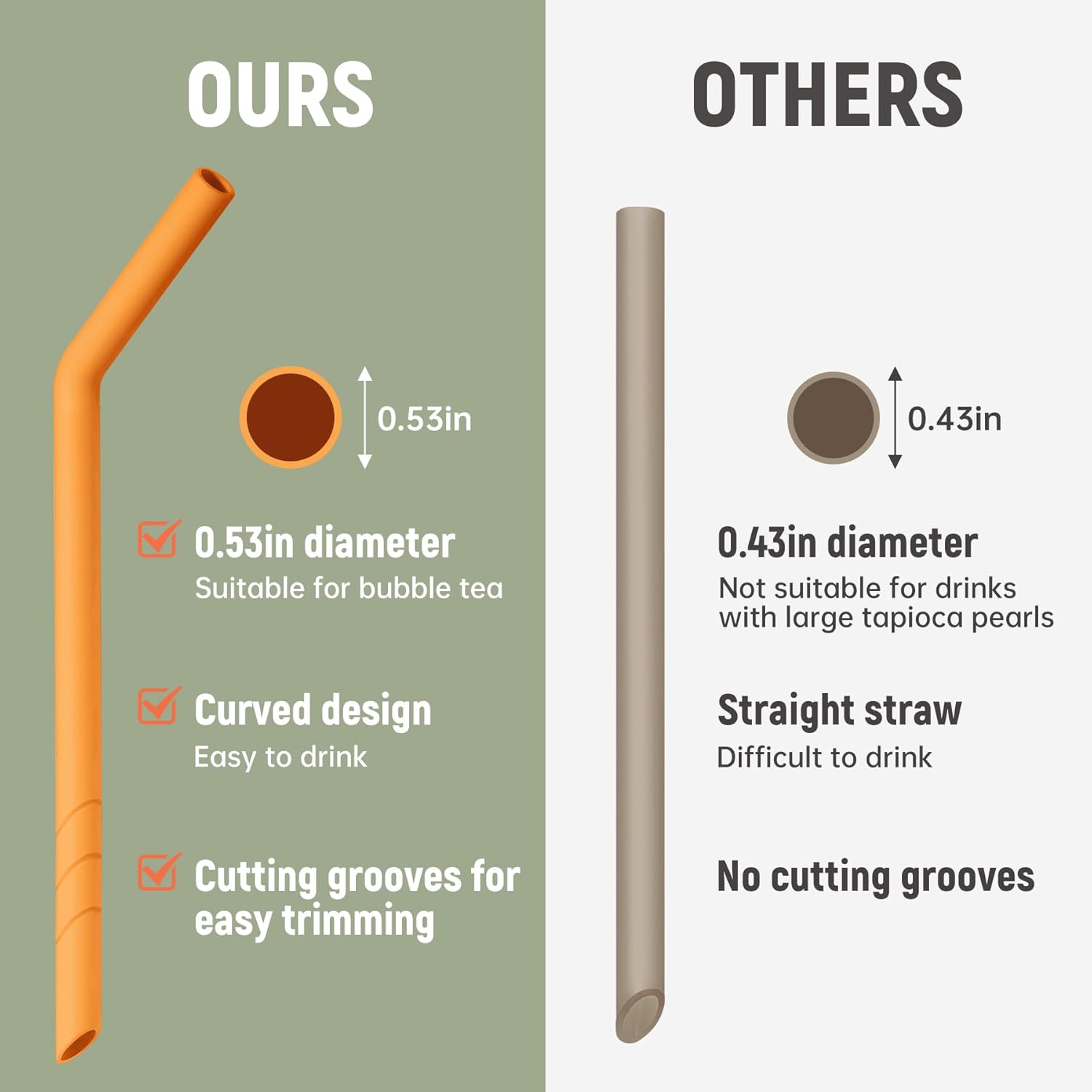 - Perfect for Thick Drinks: No more hassle when enjoying your favorite thick beverages! Our reusable silicone straws are specifically designed for thick drinks like smoothies and bubble tea. Whether it’s a creamy milkshake or chunky boba, these straws make sipping effortless.
