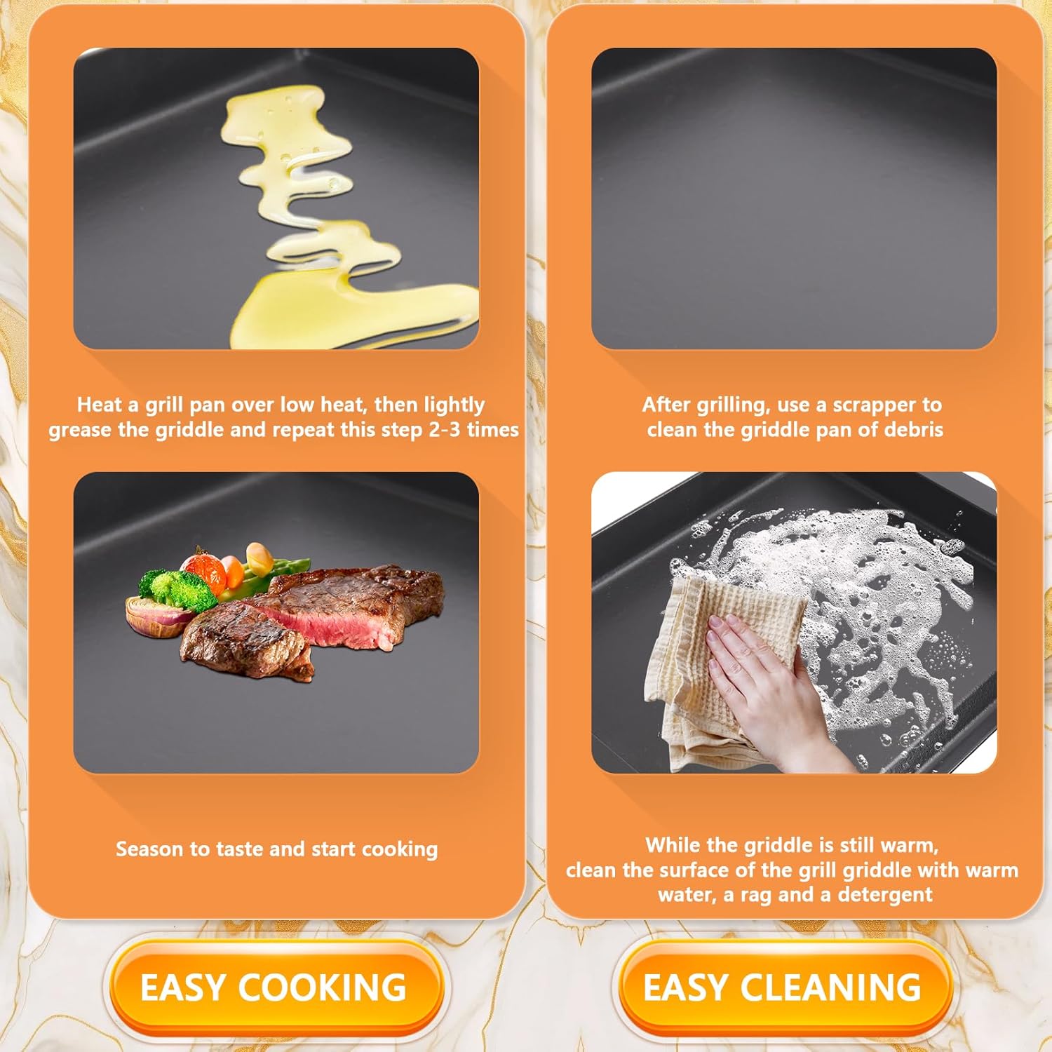 - Unique Design: The cast iron grill top has high enough sides to ensure that food doesn't fall off, making it suitable for cooking a wide range of foods at the same time. This griddle top is large enough for you to prepare an entire meal at once and increase your cooking efficiency. It's great for pancakes, kebabs, burgers, eggs, bacon, vegetables, salmon and more! The oven top griddle with handles design makes it easy to move and adjust the position and placement of the flat top grill plate.