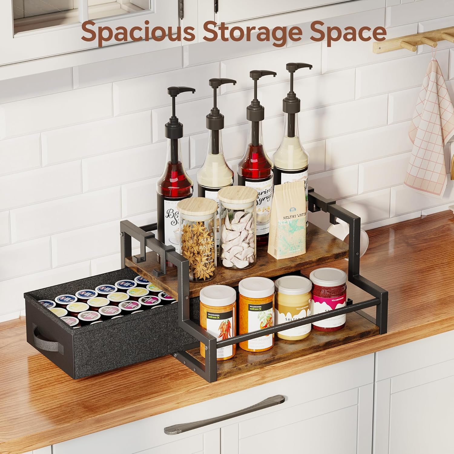 Coffee Syrup Organizer Rack, 2-Tier Coffee Bar Accessories, Bottle Holder Stand with K Cup Storage Drawer for Coffee bar, Wine Rack, Storage Shelves for Syrup. (Rustic Brown)