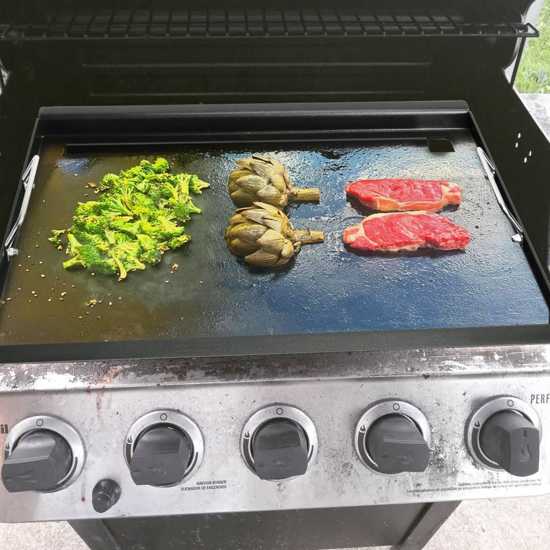 - 【Features】The inserts griddle is closer to the fire source and heats up more easily than other griddles placed on the grates to achieve the temperature needed to cook delicious food. Before use, please remove the grate & emitter plates to achieve closer to the heat source. The surface of the baking pan is made of coating, durable and easy to clean, need to be heated and oiled 1-2 times before use for better results.