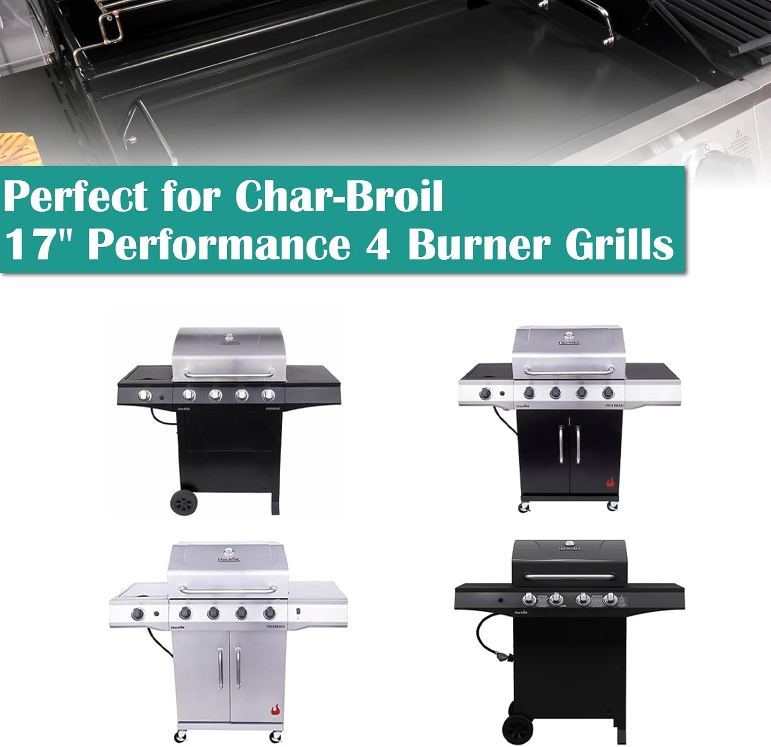 - 【Perfect for Charbroil Performance 4 Burner Series Grills】Flat Top Grill Griddle compatible with charbroil Grills model 463365021 463351021 463350722 463354021 463365522 463352521 463351221 463350521 463350922 463353521 463353021 463351521 463352021 463344523 Grills.【Note】Because the Performance Series grills are manufactured in different years, the dimensions vary, so please check whether the front and back of the grill is 17 inches or 18 inches in length before purchasing.
