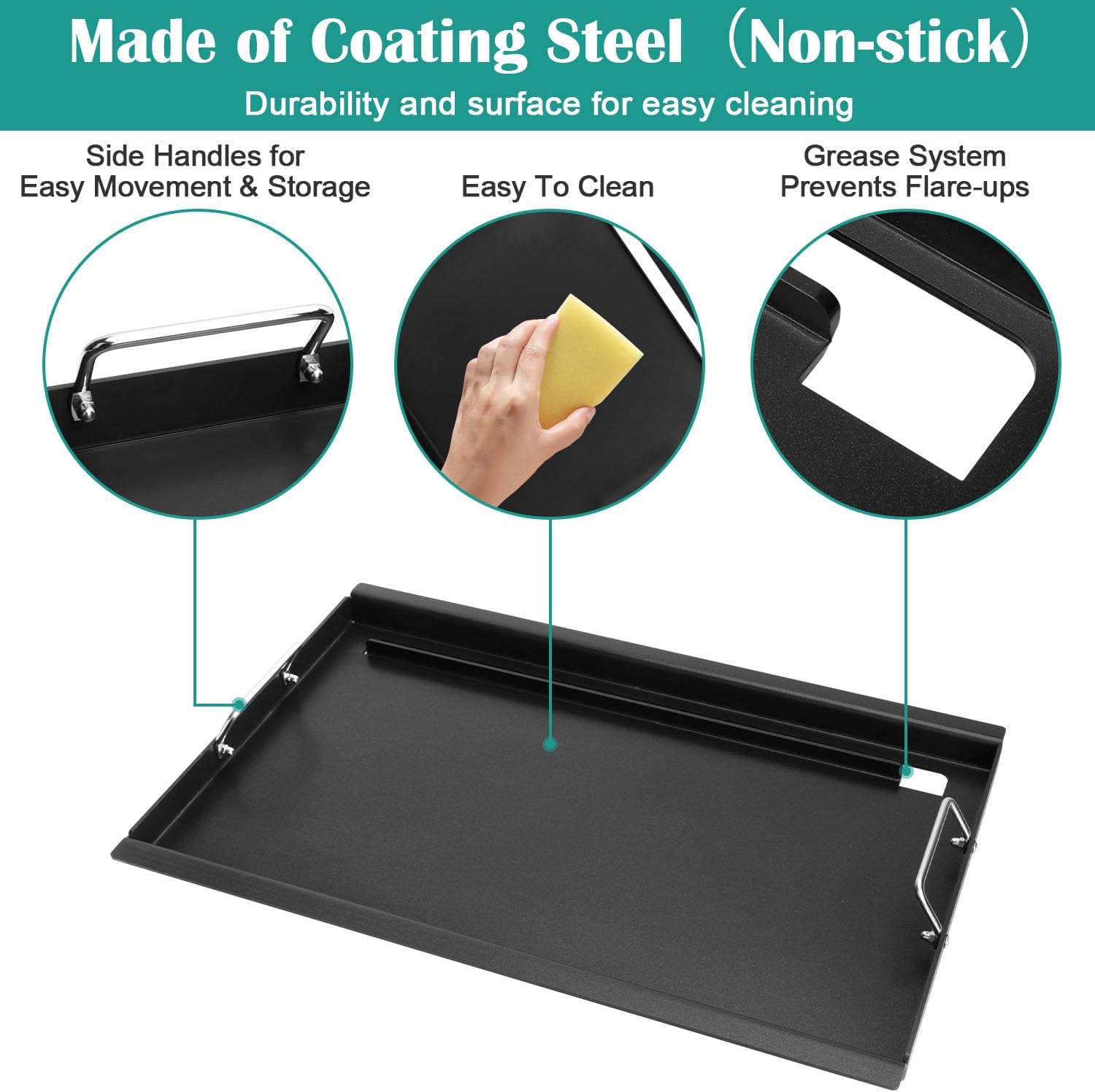- 【Features】The inserts griddle is closer to the fire source and heats up more easily than other griddles placed on the grates to achieve the temperature needed to cook delicious food. Before use, please remove the grate & emitter plates to achieve closer to the heat source. The surface of the baking pan is made of coating, durable and easy to clean, need to be heated and oiled 1-2 times before use for better results.