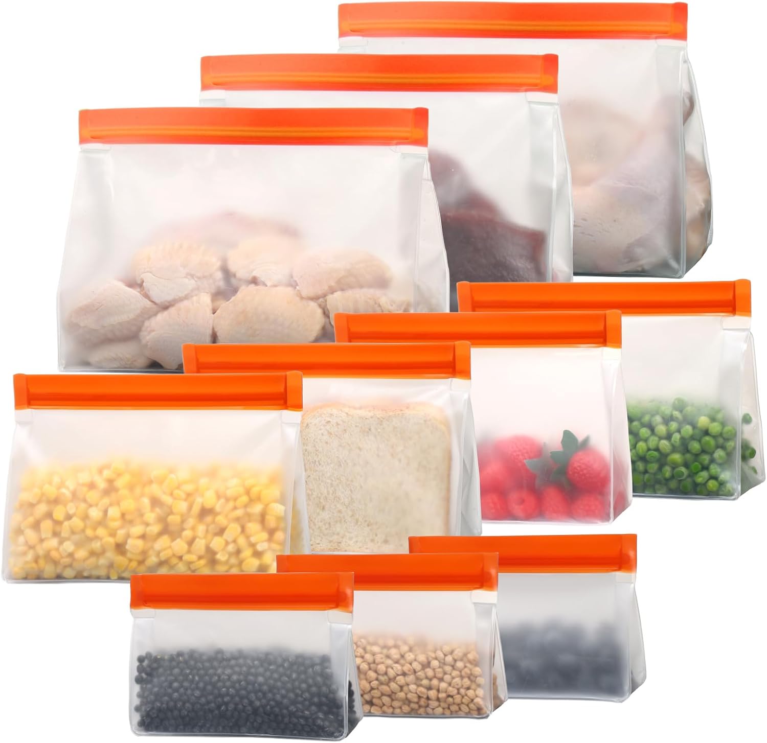 - [Multiple Sizes for Different Needs] Choose from gallon, sandwich, and snack bags to suit your storage need. Gallon bags are perfect for larger portions of meat and vegetables. Sandwich bags work well for smaller items like fruits, veggies, and sandwiches. Snack bags are ideal for nuts and dried fruits