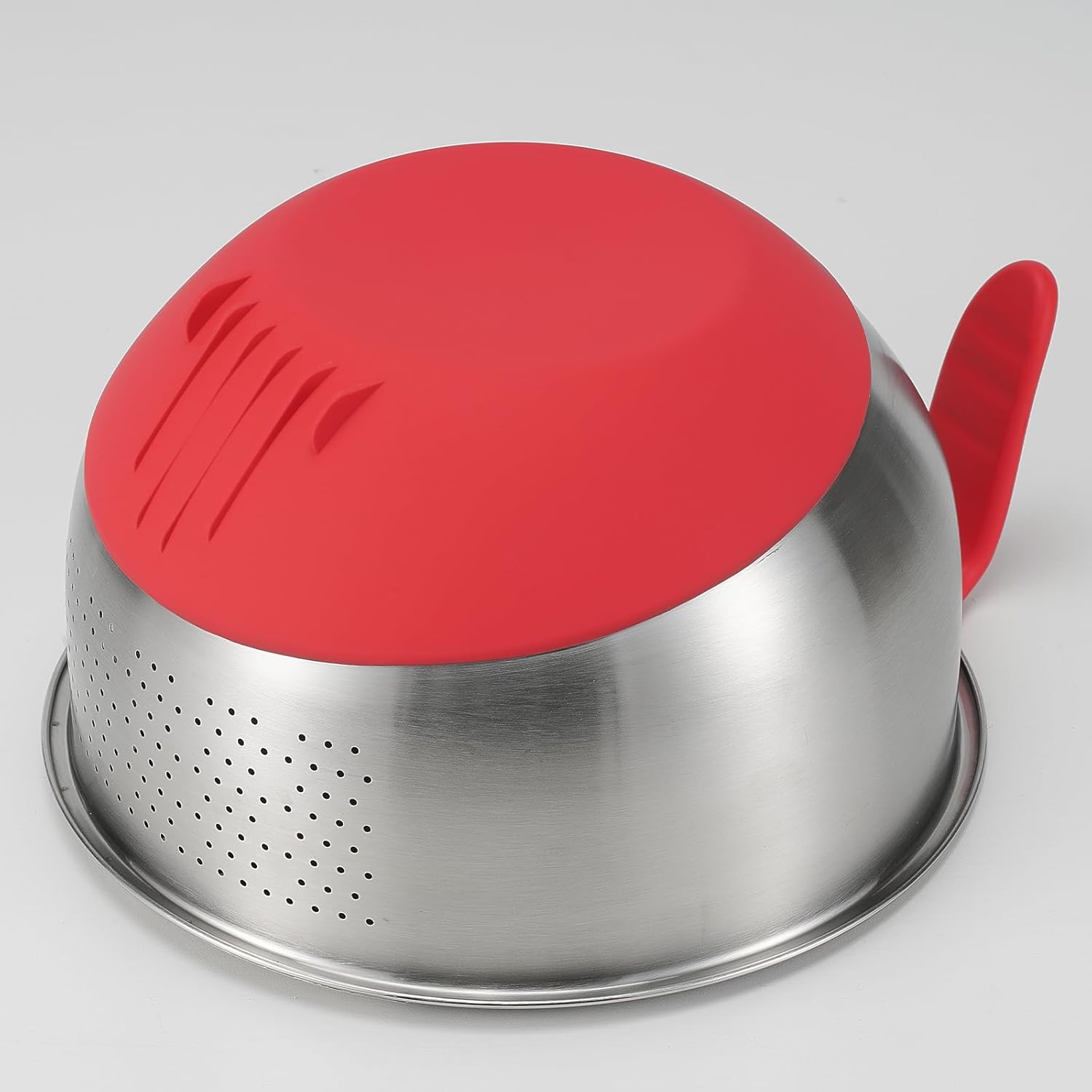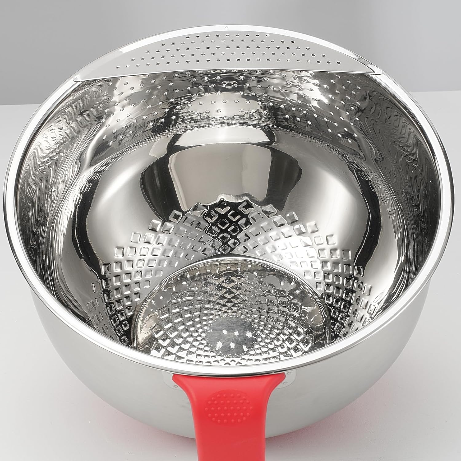 Rice Washer Strainer Bowl Quinoa Washing Bowl whit Handle Stainless Steel Colander Versatile Side Drainers for Cleaning Rinsing Fruits, Vegetables, and Beans - Tilting Non-slip Silicone Bottom, Red