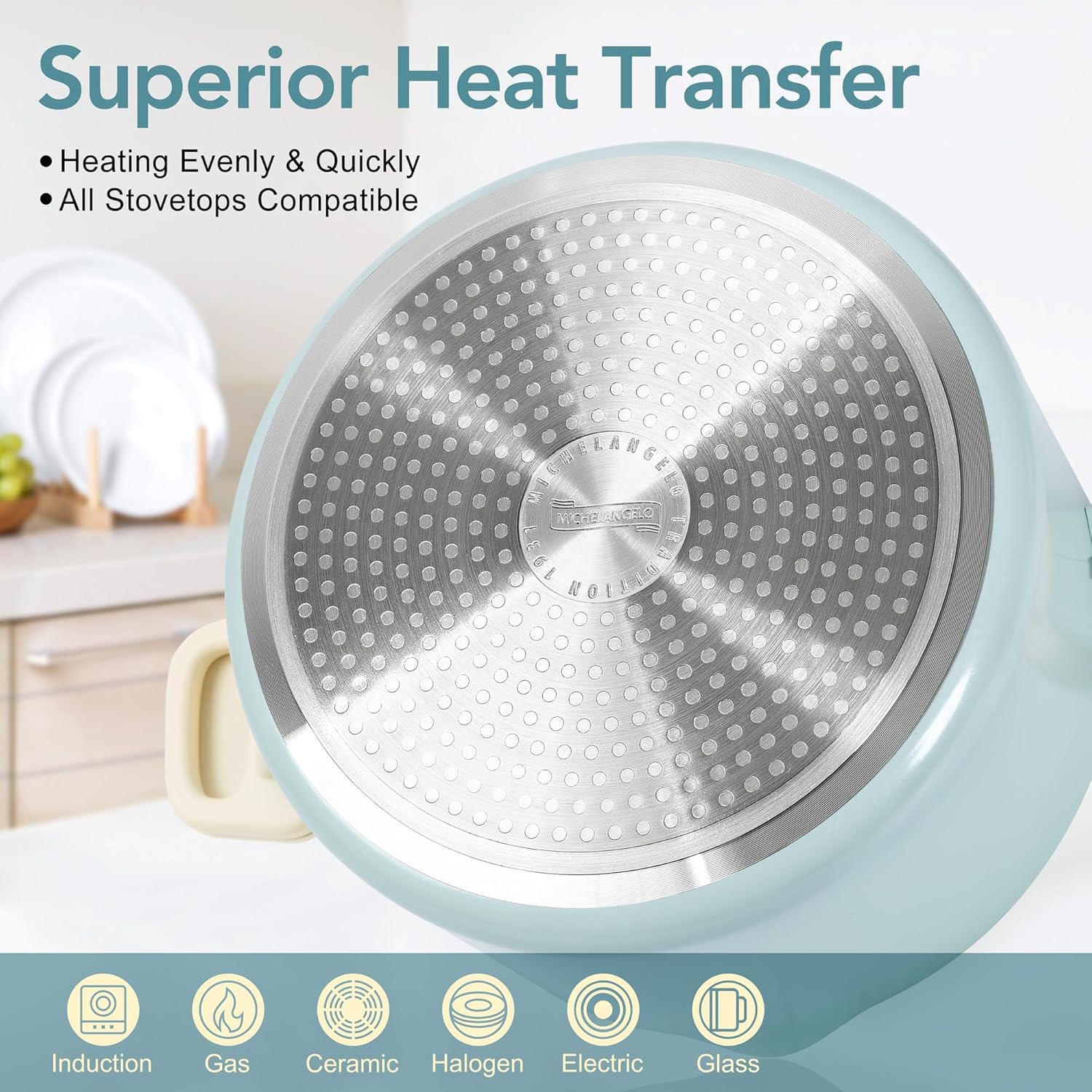 MICHELANGELO Pasta Pot with Strainer Lid - 6 Quart Cooking Pot with Lid, Non Stick Spaghetti Pot Ceramic Coated with Twist and Lock Handles for Easy Draining, Induction Compatible, Soft Aqua