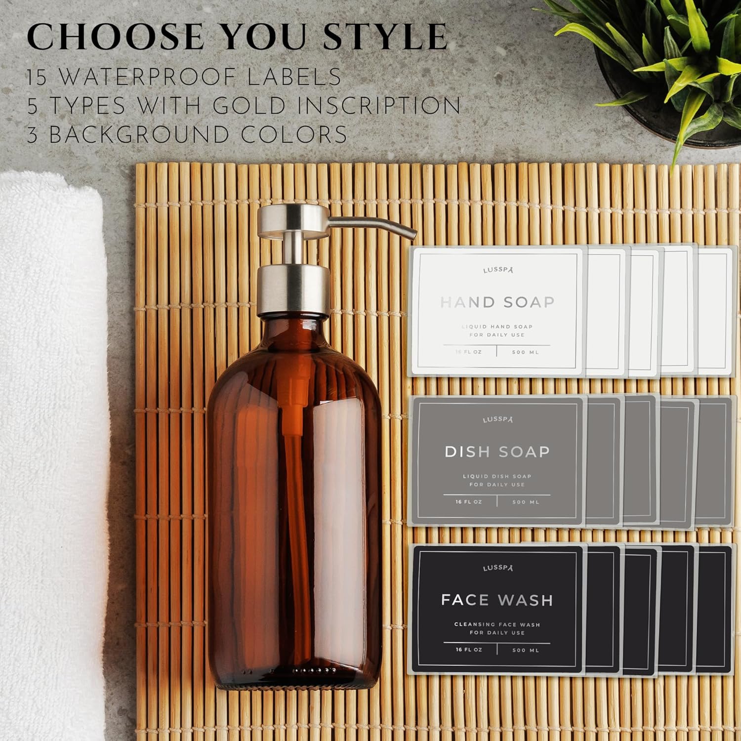 - THIS COMPLETE SET INCLUDES 2 16.8 Oz Boston round amber glass bottles, 2 brushed silver wide tops stainless steel pumps, black silicone tray, and 15 waterproof labels (HAND SOAP, DISH SOAP, FACE WASH, SANITIZER, LOTION in white, black, gray color and silver lettering), ready for immediate use.