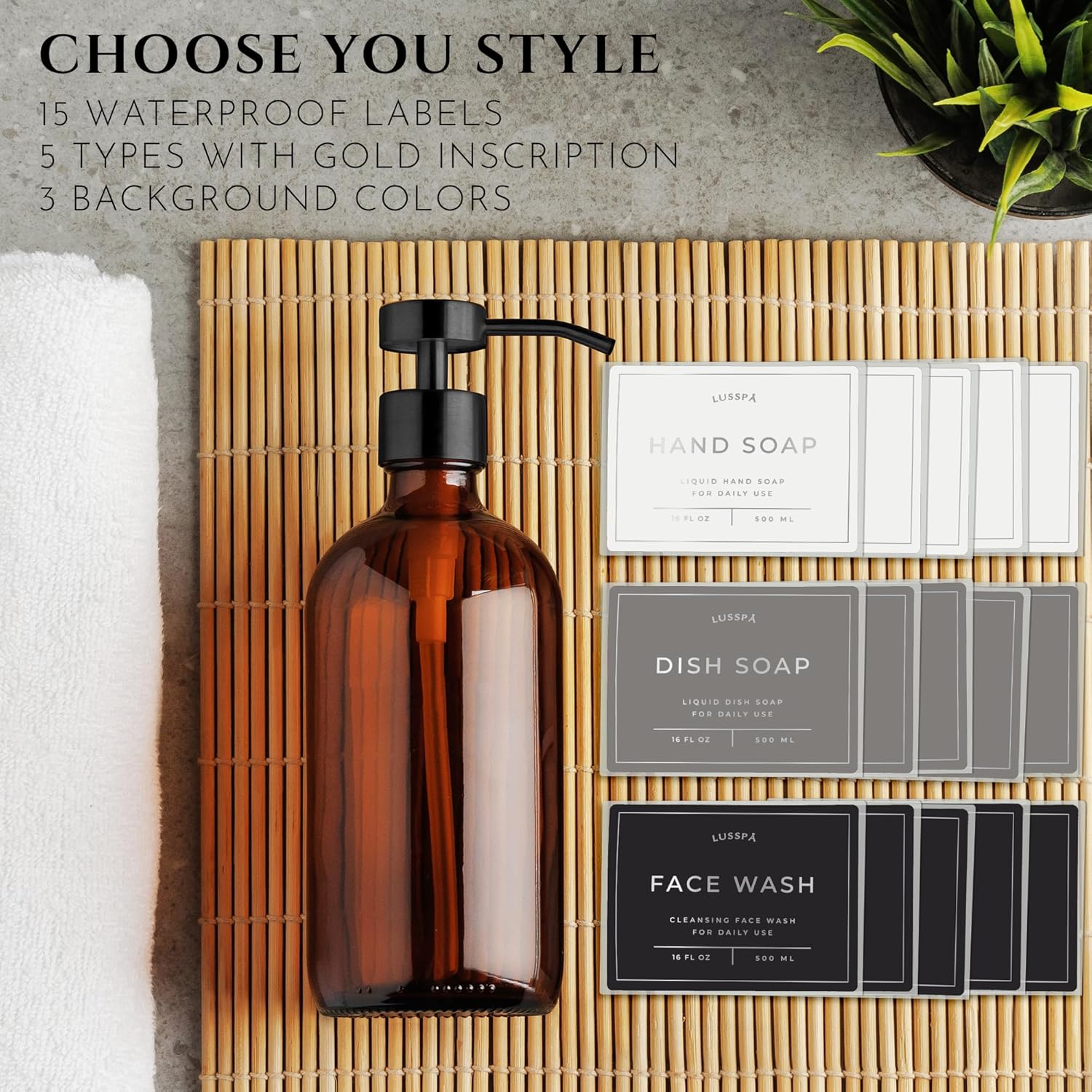- THIS COMPLETE SET INCLUDES 2 16.8 Oz Boston round amber glass bottles, 2 black matte wide tops stainless steel pumps, black silicone tray, and 15 waterproof labels (HAND SOAP, DISH SOAP, FACE WASH, SANITIZER, LOTION in white, black, gray color and silver lettering), ready for immediate use.