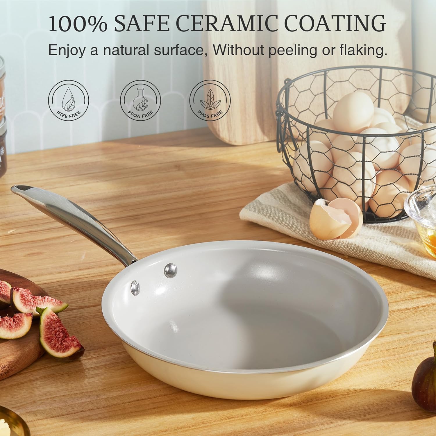 KITEXPERT Non Stick Frying Pans Set, Titanium Ceramic Pan Skillet Set Non Toxic, 8" 9.5" 11" Nonstick Frying Pan, Stainless Steel Handle, Dishwasher & Oven Safe, PFAS & PTFE & PFOA Free, Cream