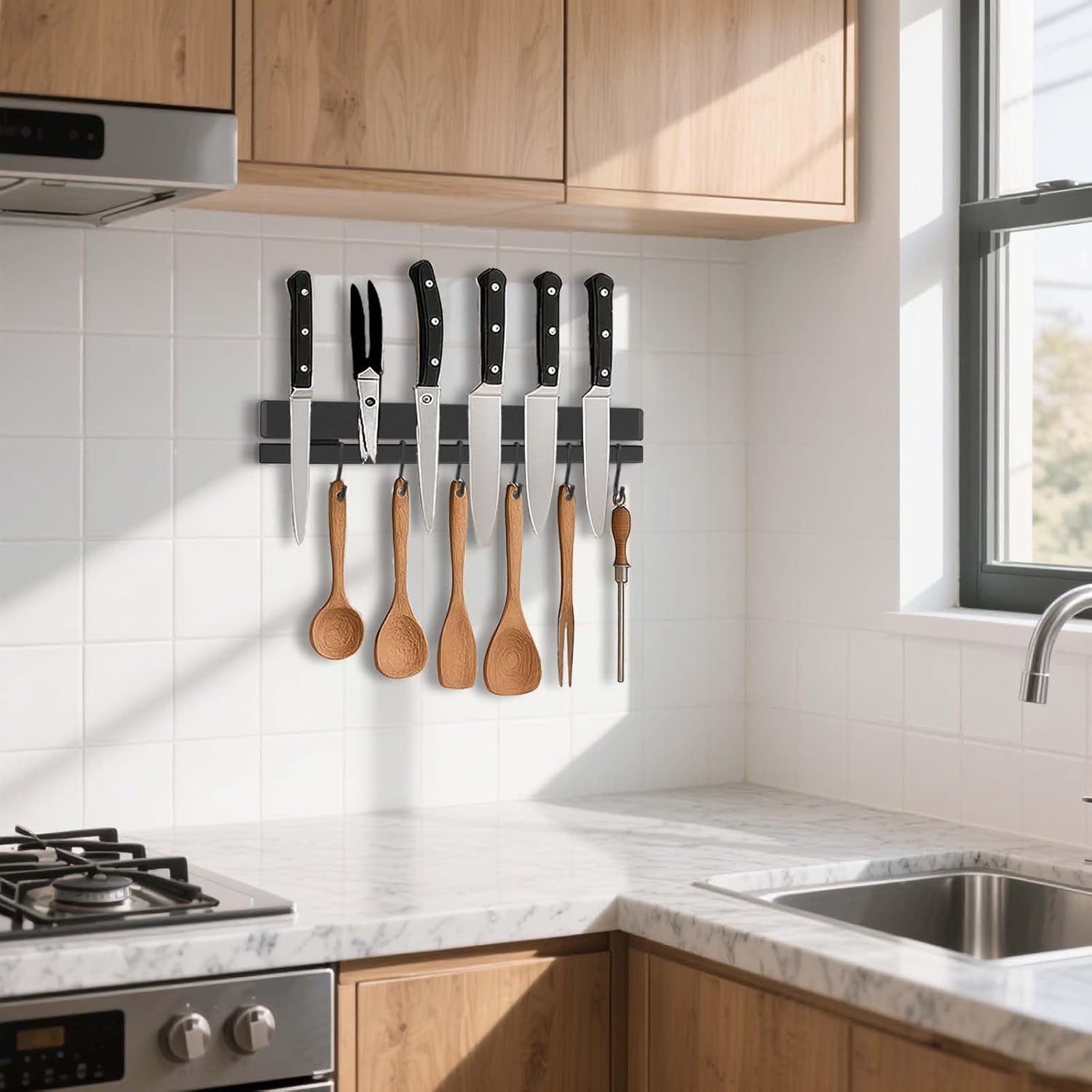 - 【12" Multifunctional Storage with 6 Hooks】Our upgraded 12-inch kitchen knife magnetic holder holds knives and includes 6 dedicated stainless steel hooks. This magnetic tool holder strip eliminates clutter by storing knives, tools, and utensils