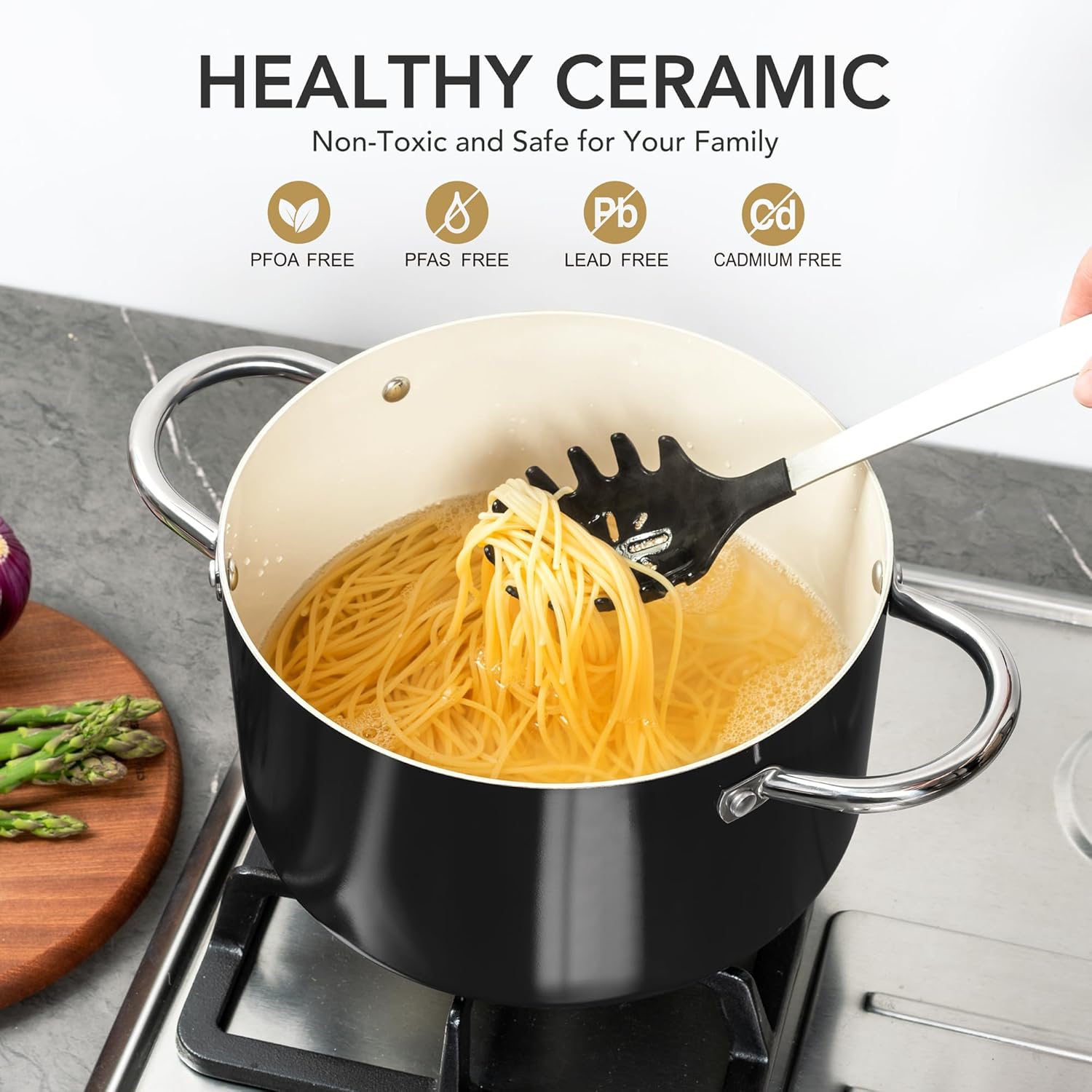 - Healthy & Non-Toxic Cooking: Our ceramic-coated stockpot is free of PFOA and PFOS, ensuring no harmful substances are released during cooking, allowing you to prepare meals with peace of mind for your family.