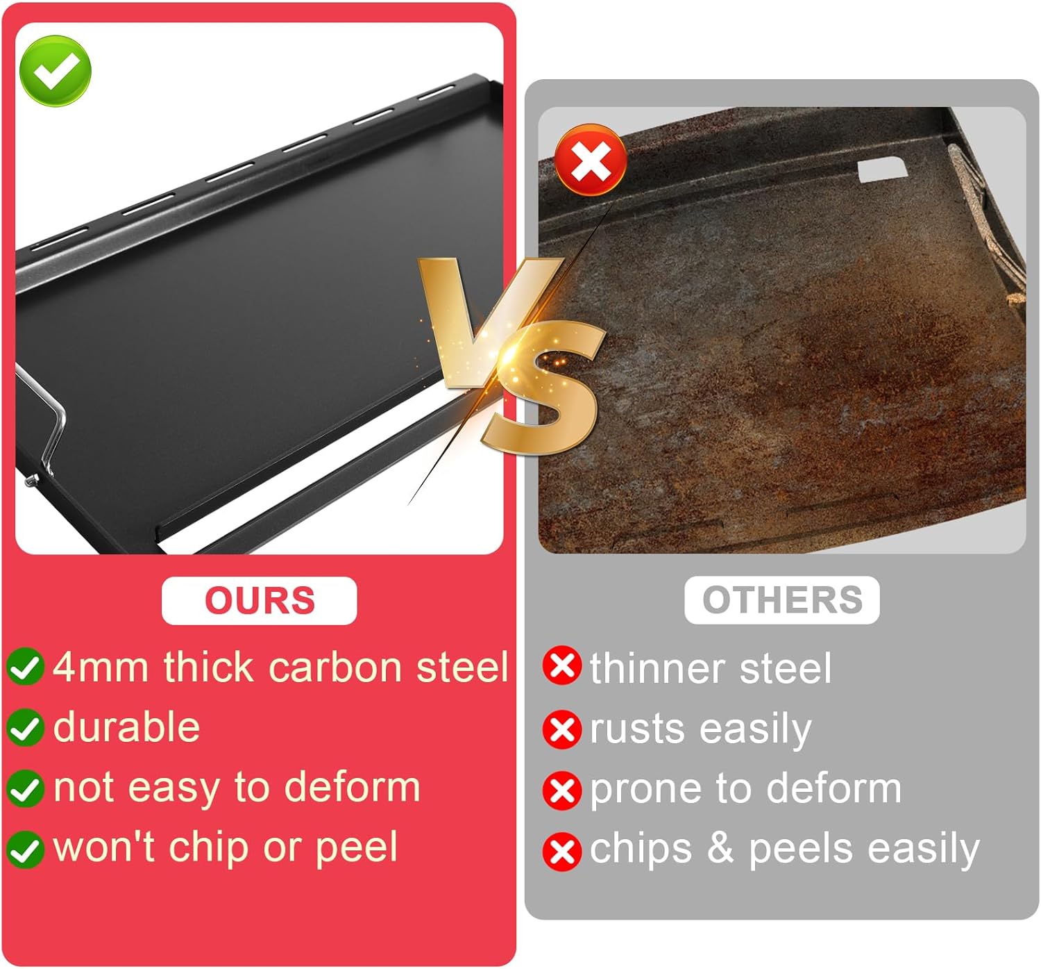 - Built to Last & Cook Like a Pro: Why settle for warped, uneven griddles? Crafted from premium 4mm carbon steel, this heavy-duty plate distributes heat evenly and handles high-heat searing, pancakes, or veggies without warping. Its rugged design resists rust and scratches, unlike thin competitors. Whether you're flipping burgers or stir-frying, this flat griddle top plate for nexgrill replacement parts 5&4 burner griddle insert outperforms Cast iron with faster preheating