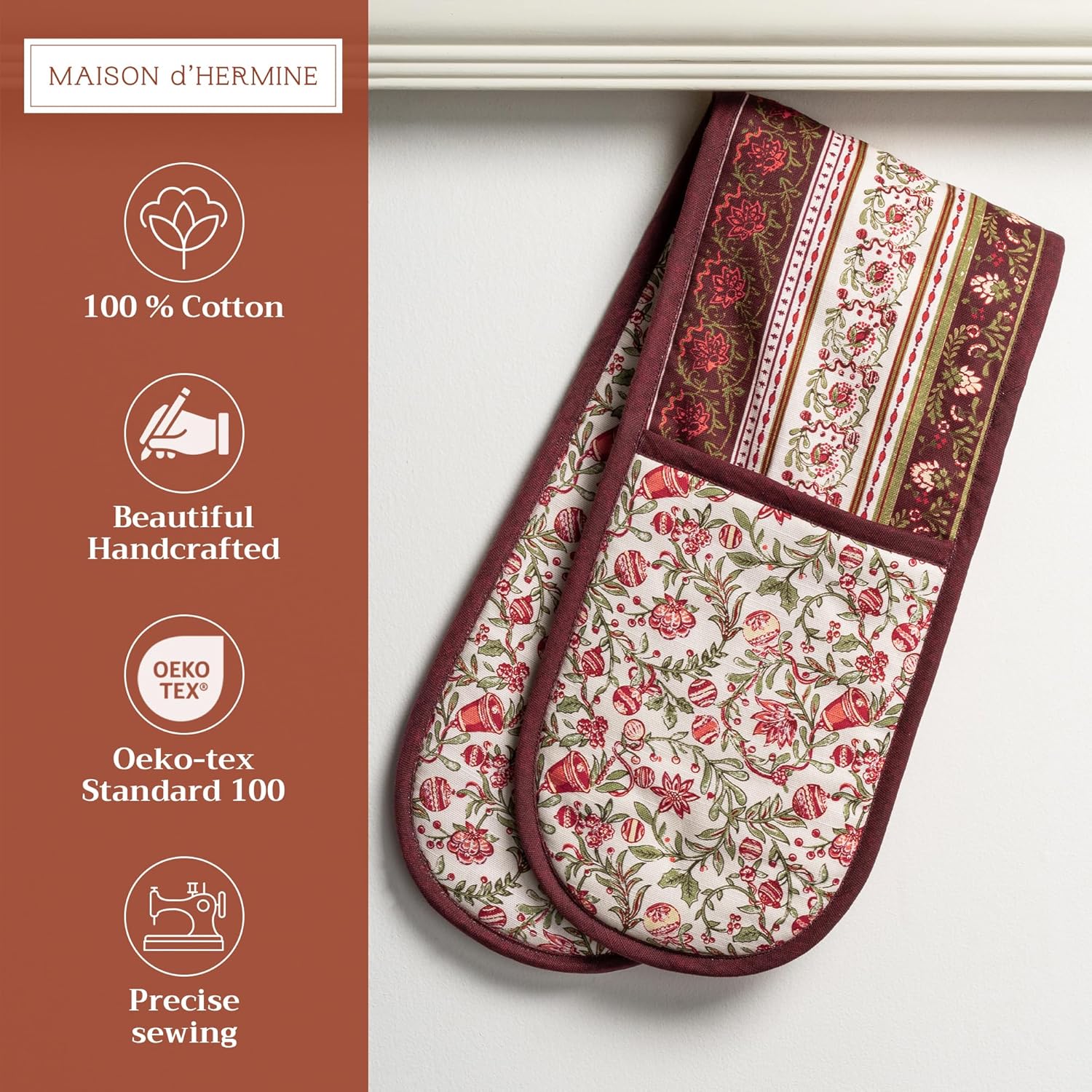 - Package includes: Includes 1 double oven mitt sized 7"x35". Perfect for handling hot cookware safely while adding a touch of European elegance to your kitchen. Designed in Europe and made in India with care