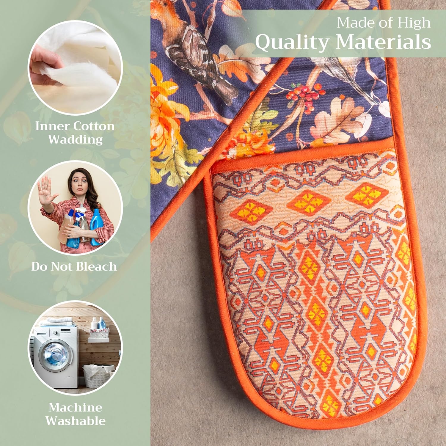 - 100% QUILTED COTTON - Unlike other double oven mitts, we only use the best quality cotton to ensure that only the finest gloves produced end up on your hands