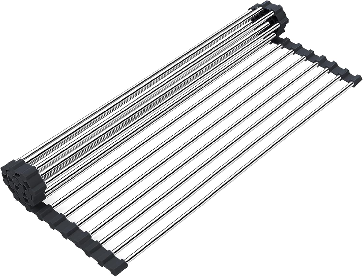 - Premium Quality, Durable and Safe : The foldable sink dish drying rack is made of 304 stainless steel tubes with firm construction that makes the collapsible cutting board over sink durable, rust resistant, waterproof and non-slip. The rollable kitchen drying rack is also made with soft silicone edge and BPA-free food grade material that can keep the safety of you and your family. The portable stainless steel rolling rack for sink is great for kitchen accessories and apartment necessities