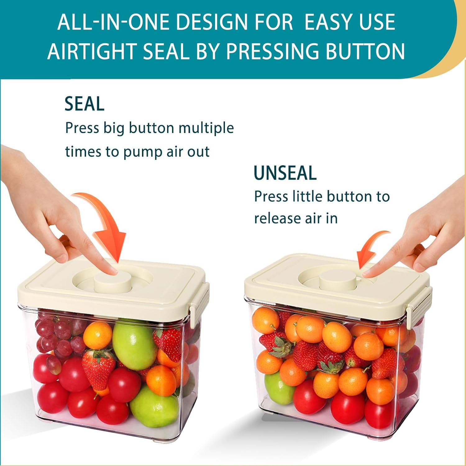 - Triple airtight storage containers: The first seal can achieve by locking the buckle, silicone rubber gasket in lid helps to provide second airtight, press big button multiple times and pump air out to reach airtight state for the third seal, all-in-one design helps to seal the container without other tools, vacuum containers are leakproof, they can help to preserve the aroma of food for 5 times longer than usual