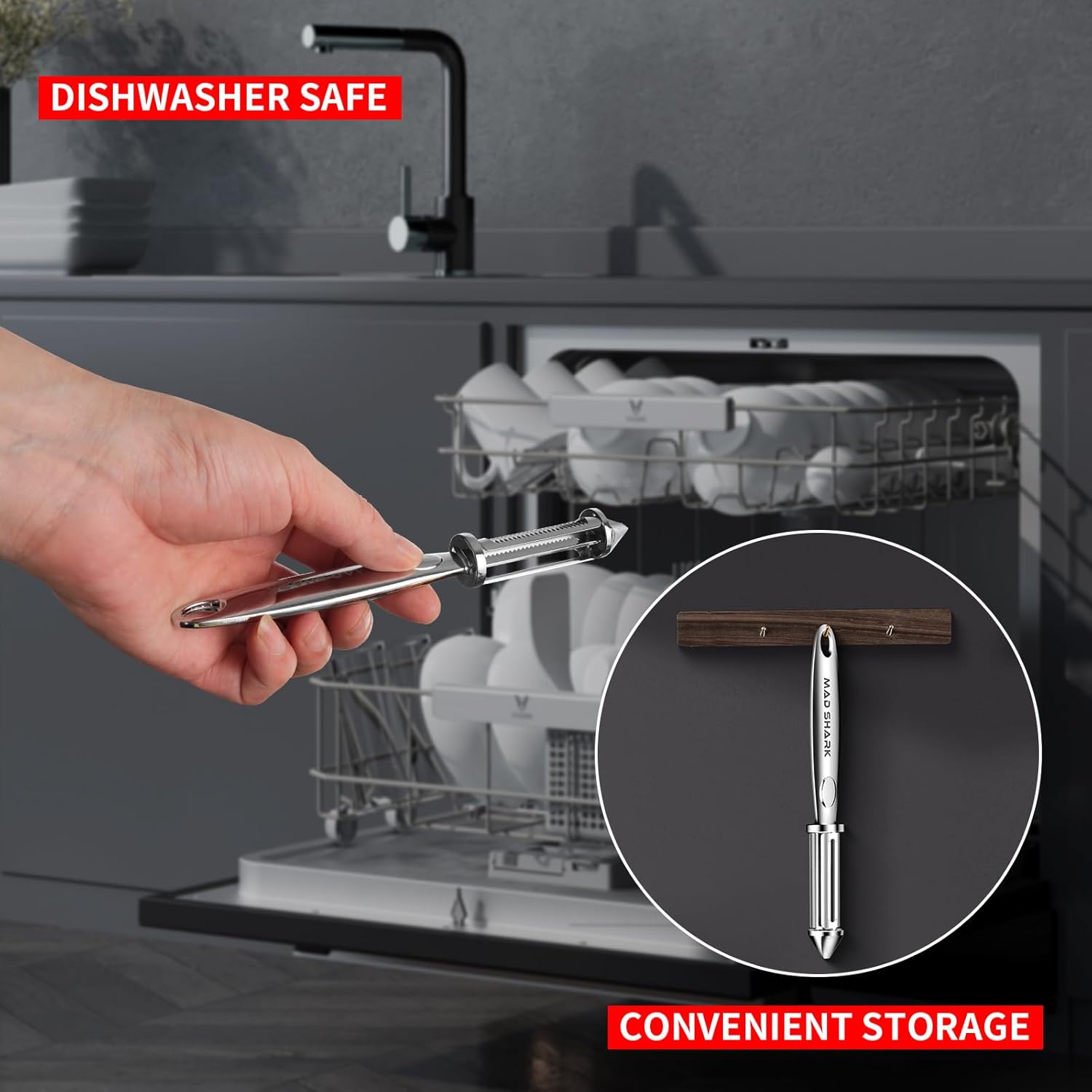 - EASY TO CLEAN: Mad Shark apple peeler is made of upgraded rust-free carbon steel blades and zinc alloy body, streamlined design, dishwasher safe or can be rinsed with water directly during use. (Due to the sharp blades, be careful not to cut your hands during the rinsing process) After washing, please keep it in a dry place, which will make the peeler last longer
