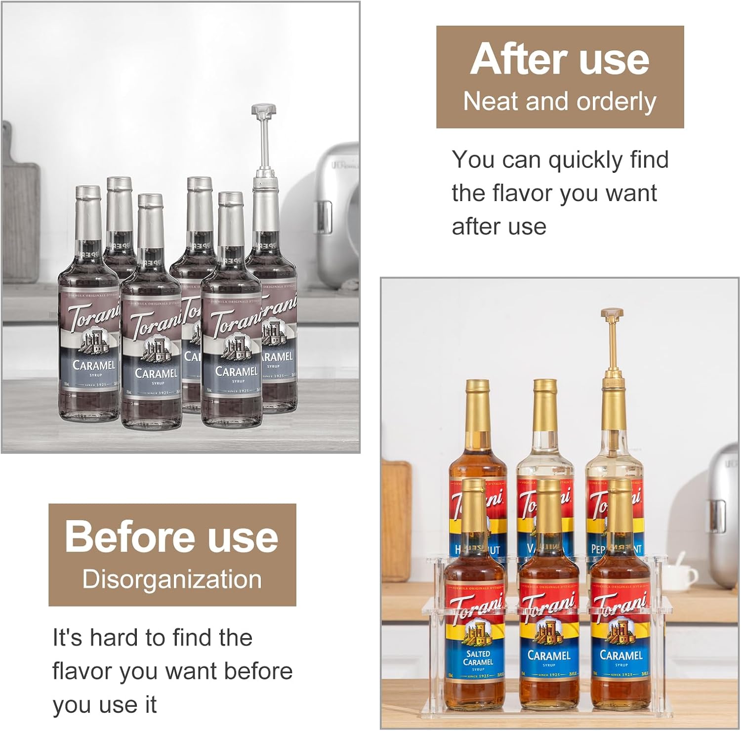 - Efficient storage: The coffee syrup rack efficiently utilizes space to store various flavors of syrups, jams and condiments, keeping the counter tidy. No more struggling to find the right syrup bottle. With our 2-tier coffee syrup organizer, all labels are clearly visible so you can quickly find the flavor you want.