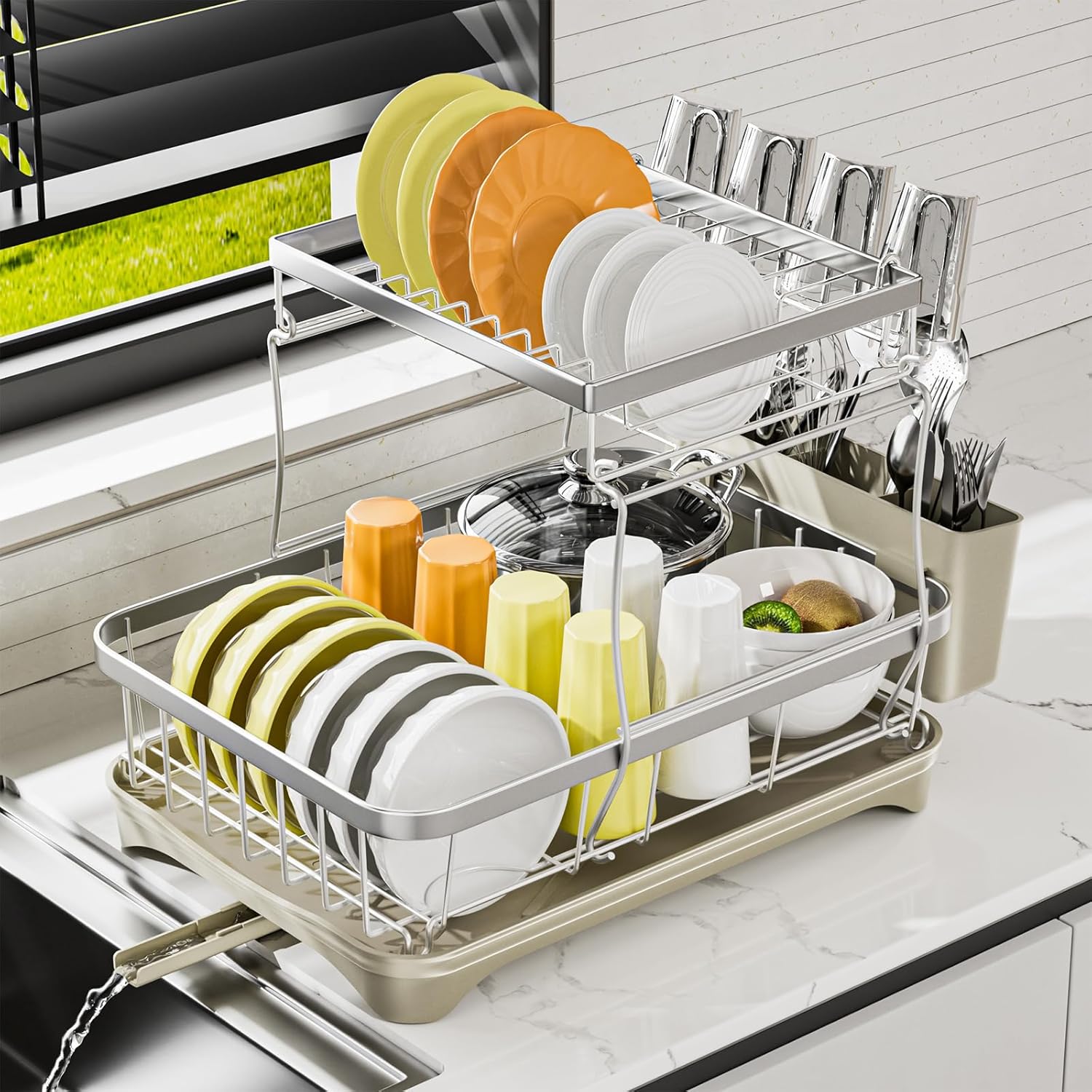 Dish Drying Rack Kitchen 2-Tier 304 Stainless Steel Dish Racks for Kitchen Counter,Dish Strainer with Adjustable Draining Tray,Drying Rack with Water Cup Hook & Cutlery Holder,Grey