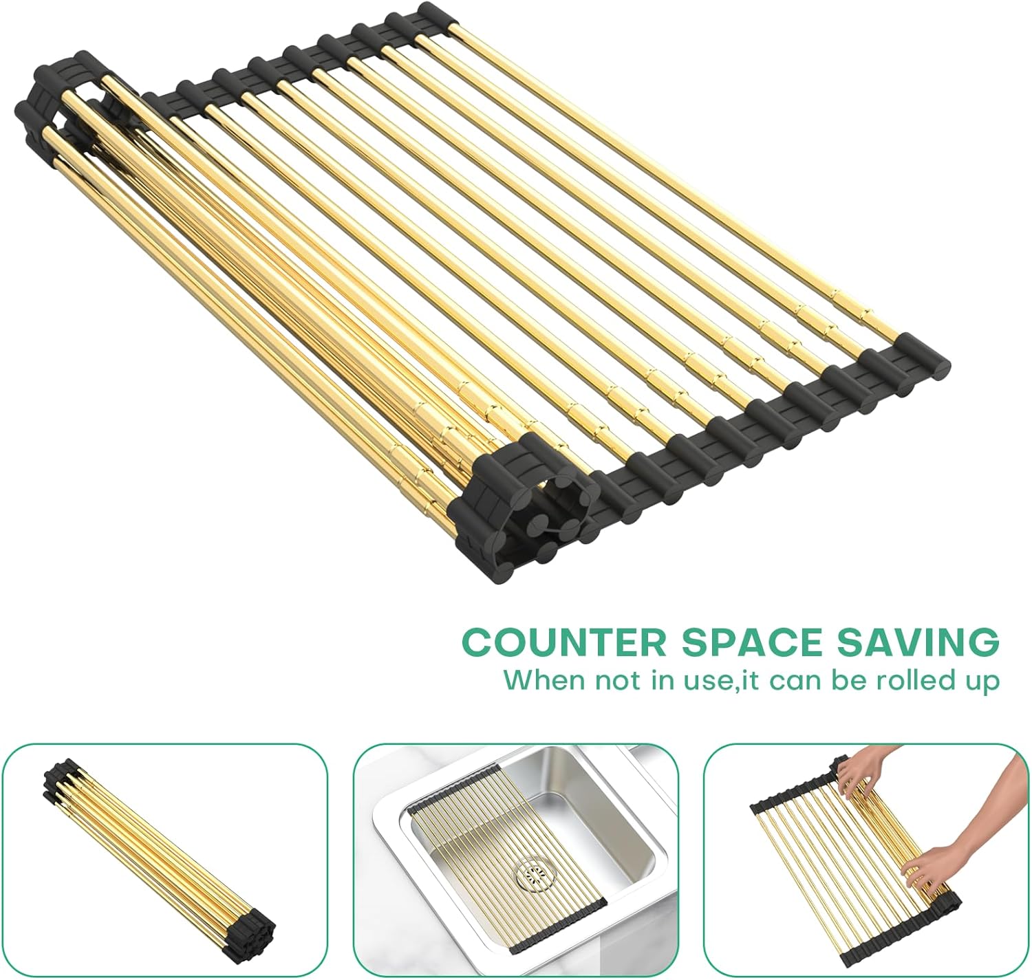 Large Telescopic Draining Rack, Gold Roll Up Heat-Resistant Dish Drainer for Stainless Steel Sinks, Non-Slip Silicone Rolling Dish Drainer Roll Rack 18 tube12.59-21.25x12.79''