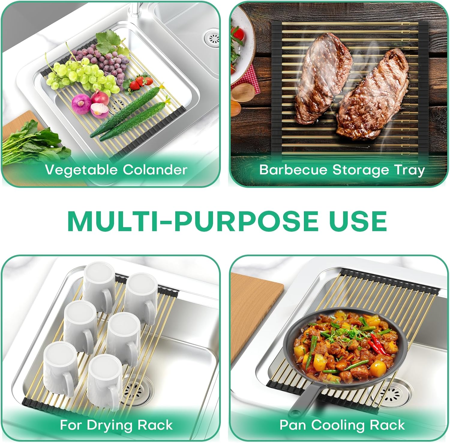- 【3 IN 1 Storage and Thermal Insulation】ARAINY roll up dish drying rack can be used to store items above the sink, and can also be used for draining after cleaning. It can also be used as a heat insulation pad, so you don’t worry about the desktop cracking or leaving u