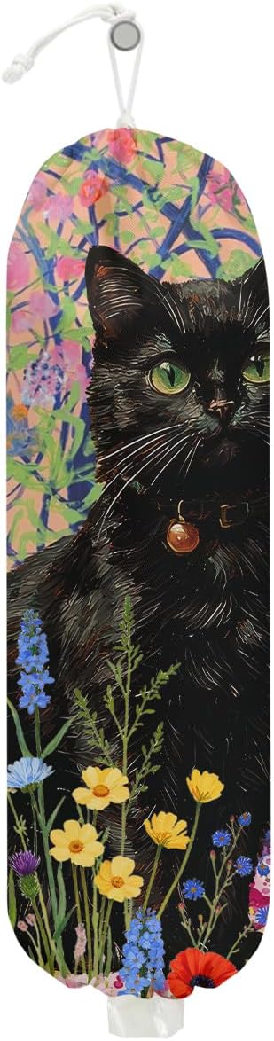 Flower Cat Plastic Bag Holder, Wall Mount Grocery Bag Holder, Plastic Storage bag, Pull Rope Free Adjustment, Plastic Bag Holders for Grocery Bags, Cat Lover Plastic Bag Dispenser for Home Kitchen