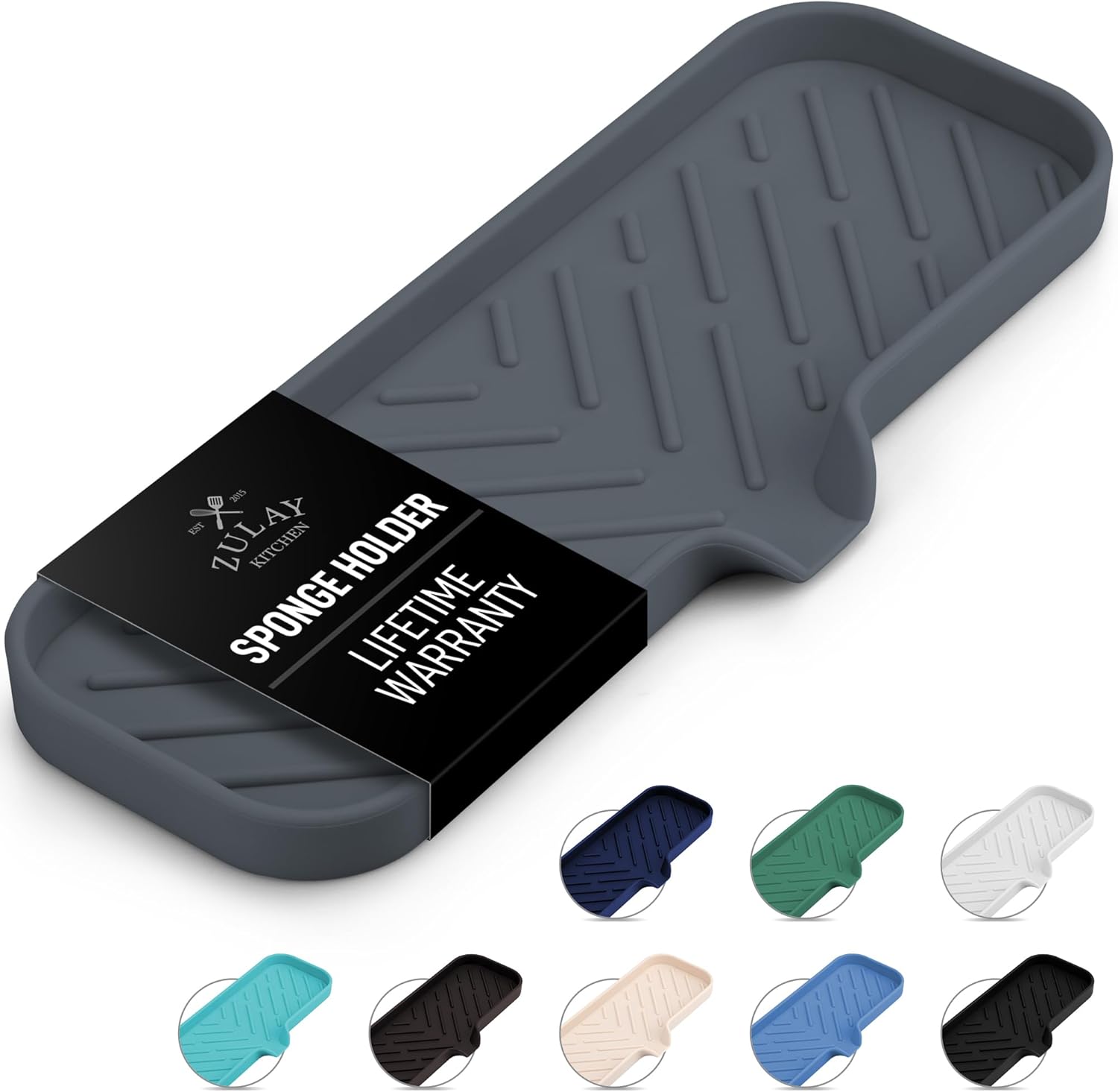 Zulay Kitchen Large Silicone Sponge Holder (12x4) – Flexible Sink Organizer Tray for Kitchen & Bathroom – Multipurpose Soap Dish for Sponges, Makeup, Trinkets & More (Grey)