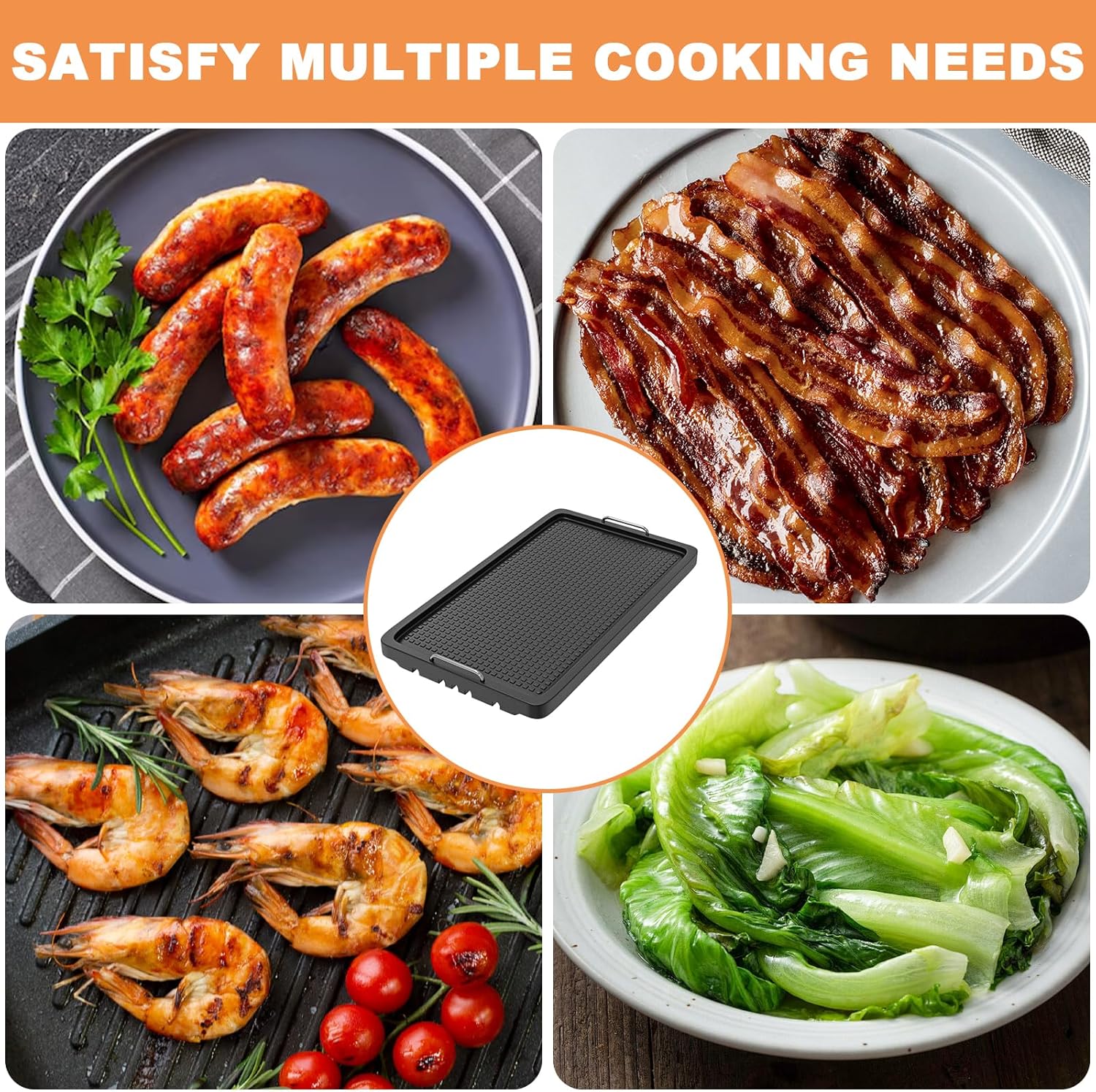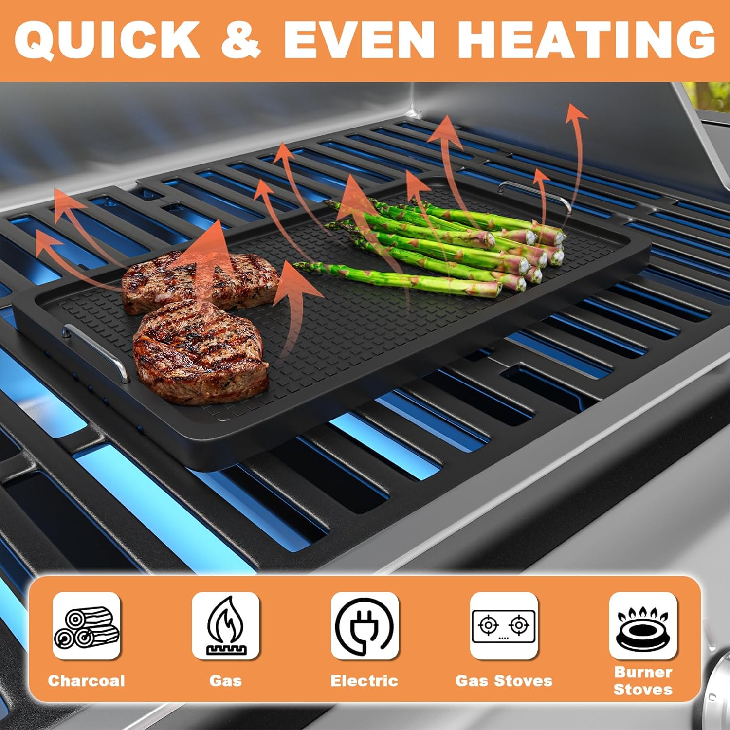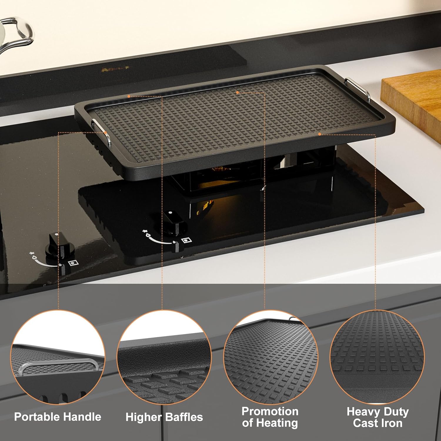 - Grill Pan for Indoor Cooking: Stovetop griddle is made of high quality cast iron for superior durability, heat retention and heat resistance. Forged at high temperatures using an advanced process, the cast iron griddle heats up faster than traditional griddles and distributes heat evenly across the surface, ensuring flawless cooking every time, ideal for achieving settled cooking results