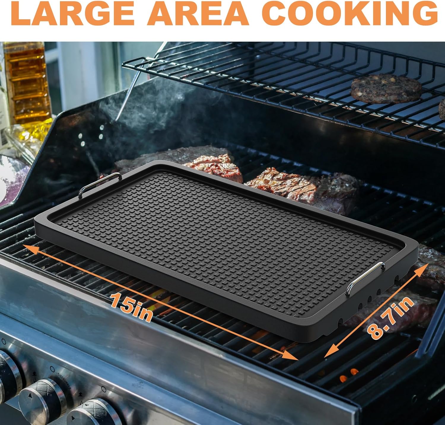 Cast Iron Griddle for Gas Grill Universal, 15" x 8.7" Griddle Pan for Stove Top with Handle, Grill Griddle, Stove Top Griddle for Charcoal/Gas/Electric Grills, Cast Iron Grill Pan for Outdoor/Camping