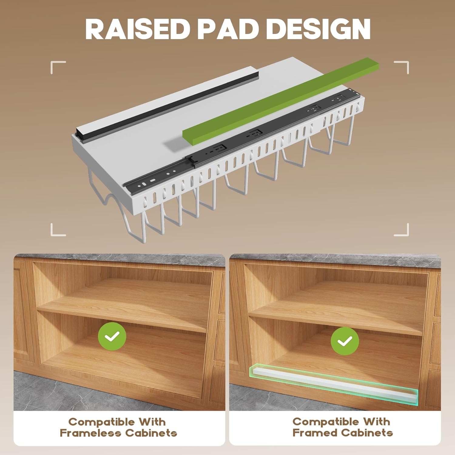 - 【Raising Pads For Framed Cabinets】:Equipped with innovative raising pads, this pots and pans organizer ensures compatibility with both framed and frameless cabinets. Enjoy hassle-free installation without compromising on functionality or design. Note: Compatible with Framed Cabinets with Edge Heights up to 0.4 Inches.