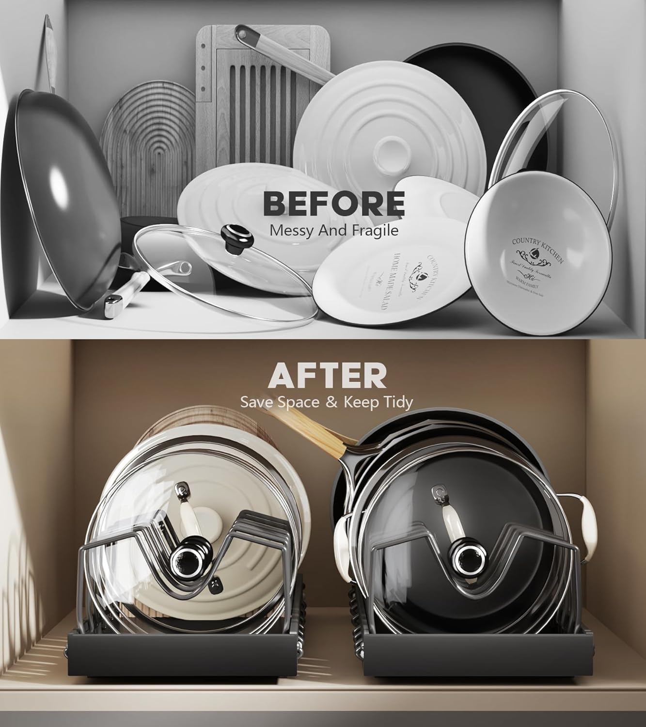 - 【Removable & Adjustable Dividers】: Pots and pans organizer under cabinet is equipped with 10 dividers for lids, fry pan, cutting board, bakeware, skillet, baking sheet and more, and you can adjust the width of the storage according to the size of the pots and pans and lids. Expandable sliding lid holder and pan rack providing ample cabinet storage for all cookware and bakeware.