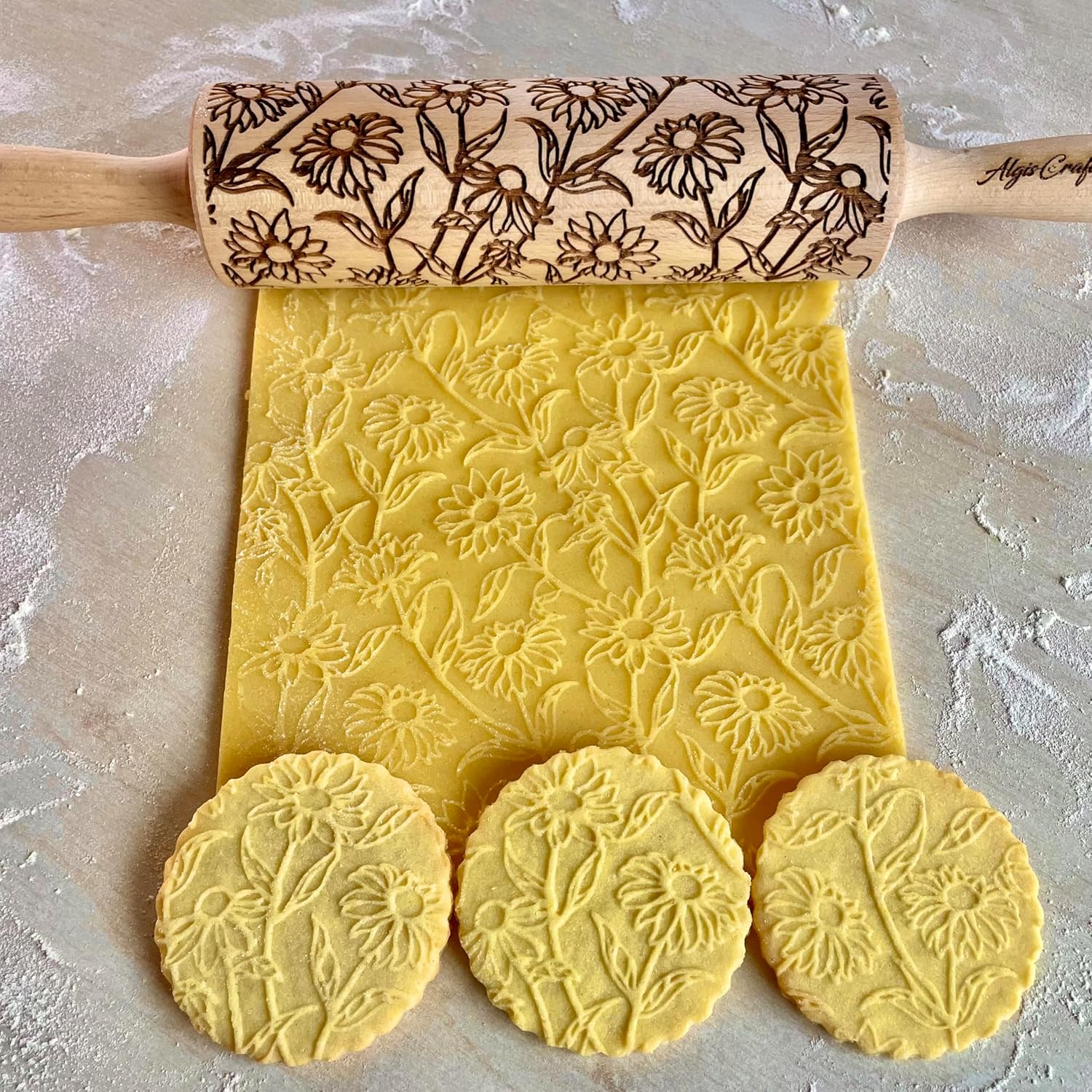 GOLDEN DAISIES Embossing Rolling Pin with Ornamental Bloom Pattern – Dough and Clay Roller for Embossed Cookies and Pottery - Cookie and Ceramic Stamp - Baking Gifts for Women by Algis Crafts