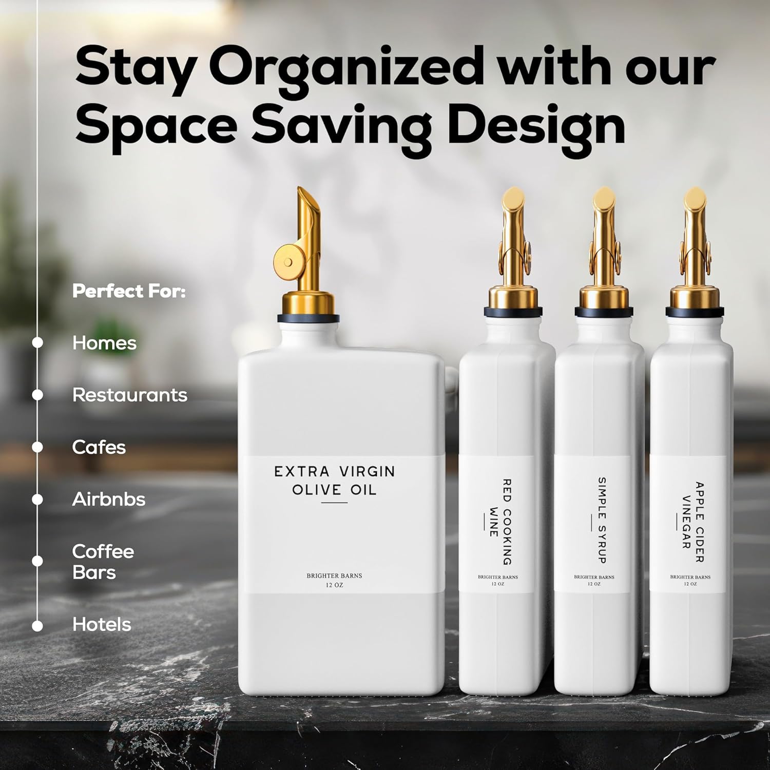 - ELEVATE YOUR SPACE & STAY ORGANIZED - Transform your kitchen with our elegant, space-saving glass oil bottles for kitchen. The sleek, minimalist design not only adds a touch of luxury but also keeps your kitchen organized with its slim, elegant profile. Tailored to blend seamlessly with any decor—from modern and luxury to farmhouse, minimalist, neutral or vintage, this is the kitchen decor upgrade your home, coffee bar accessories, Airbnb, café, or restaurant has been waiting for.