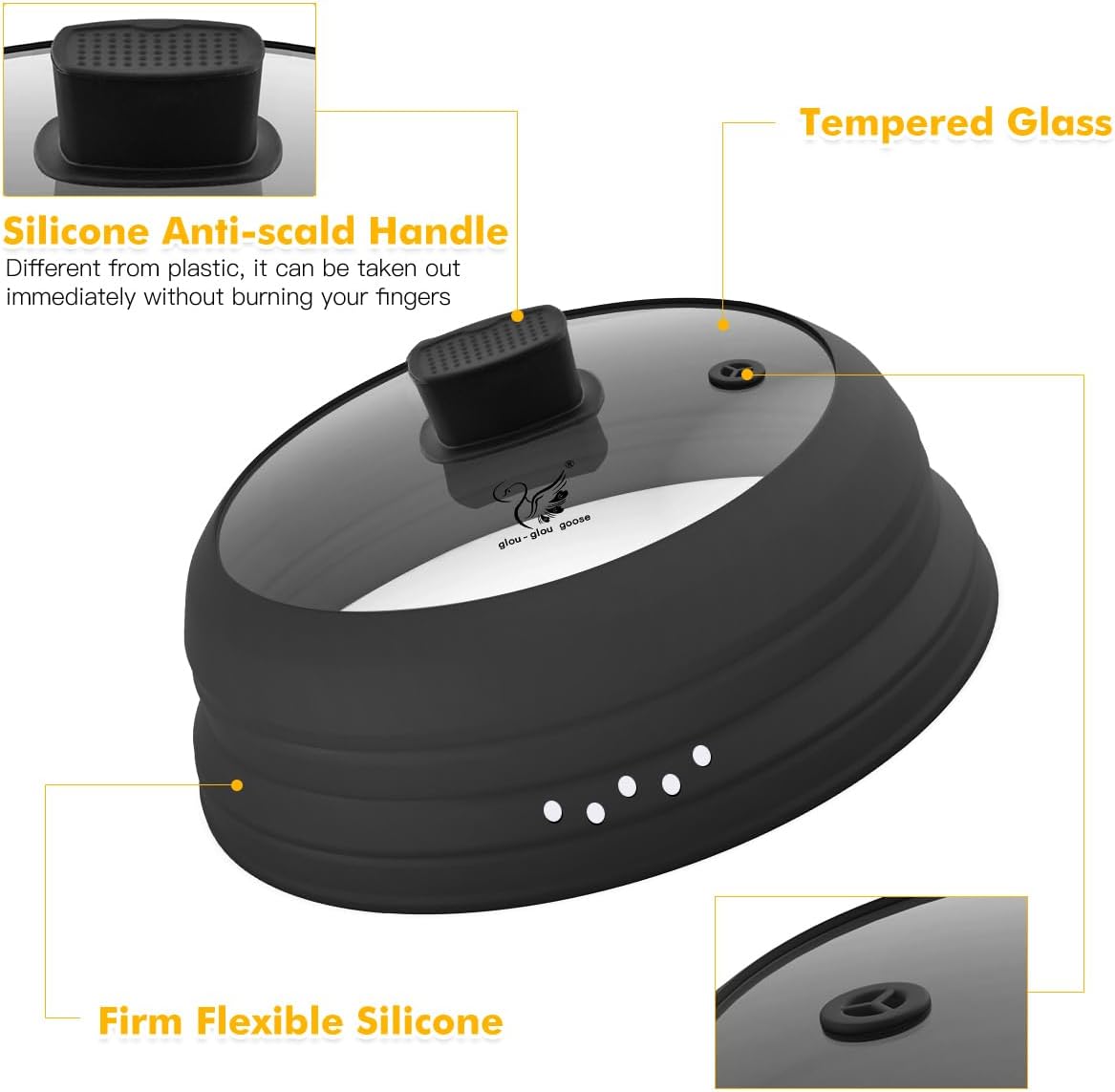 Microwave Splatter Cover Glass Cover Guard Lid with Collapsible Silicone for Food Pot Plate Cover 11.8 inch Black