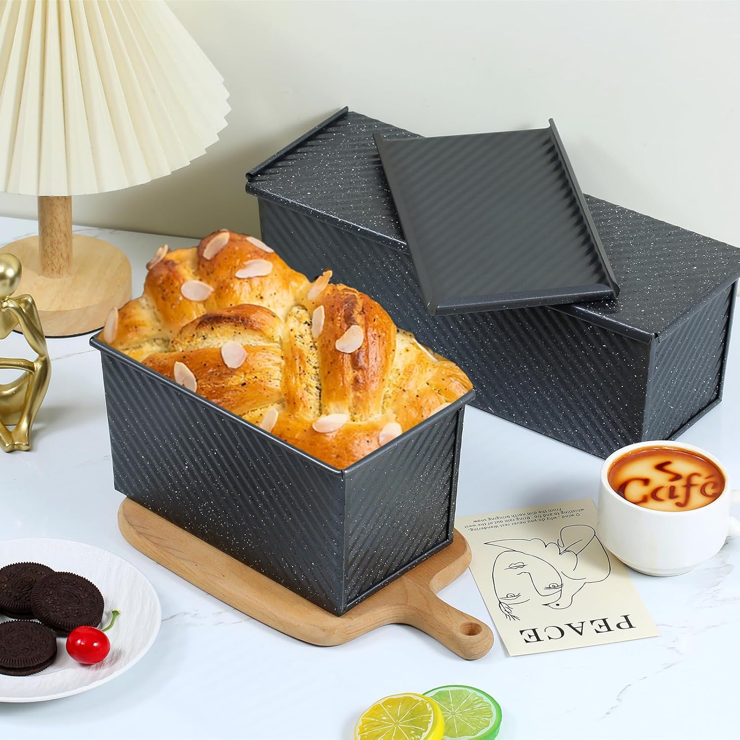 - DOUBLE CAPACITY, ENDLESS OPTIONS: Meet all your baking needs with 2 commercial-grade pullman loaf pans! The 12.5x4.8 inch pan handles 2.2lb dough for family-sized sandwich bread, while the 8.3x4.7 inch pan (1lb capacity) bakes personal sourdough loaves. Durable carbon steel construction withstands 450°F heat for even baking. Includes lids to lock freshness and shape perfect square loaves.