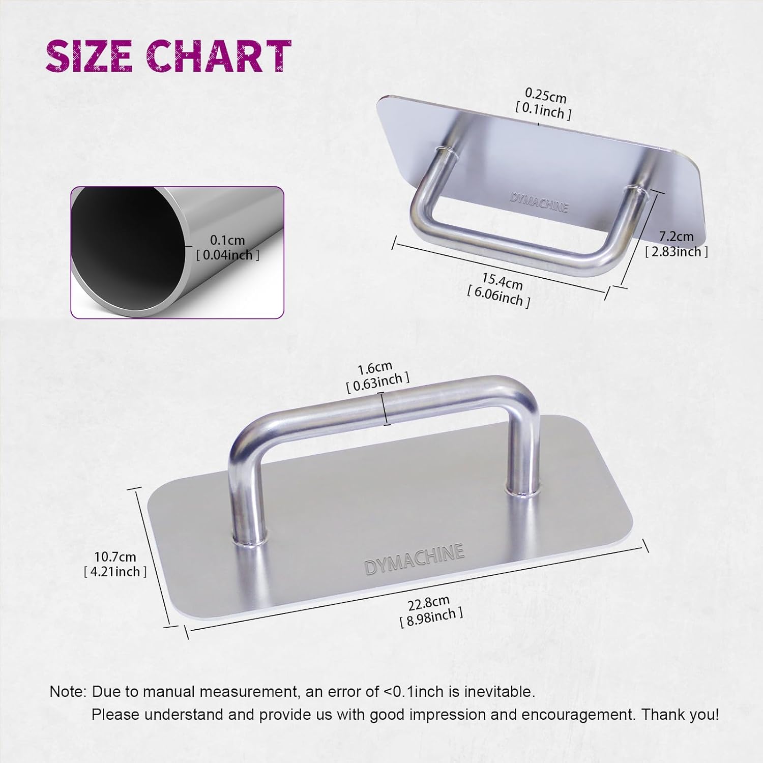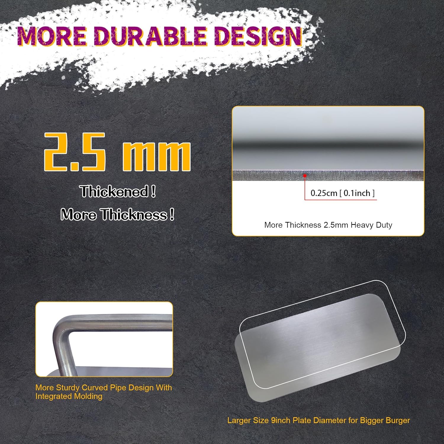 - Specially Designed For Large Meat Patties - DYMACHINE smash burger press made of brushed stainless steel 304 material, integrated bend tube forming, laser welded to the pressure plate in bottom, perfectly combined, extremely sturdy, ensuring worry free cooking time. The diameter of the bent pipe is 20mm, the wall thickness is 1mm, and the thickness of the pressure plate is 2.5mm. The higher thickness makes it easier to shape your meat patty, very practical!