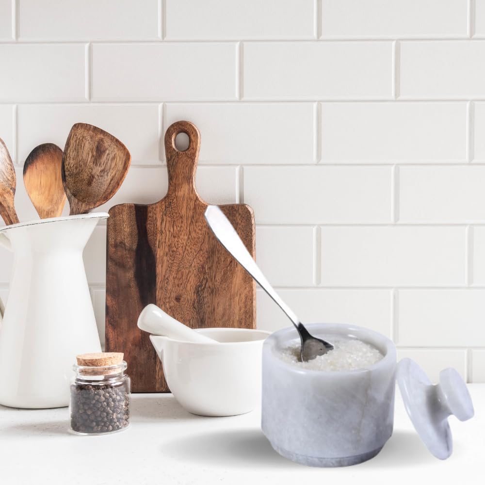 - VERSATILE STORAGE: Salt cellar with lid and spoon perfect 3.5-inch size container ideal for storing cooking essentials like salt, sugar, spices, or any small culinary ingredients.