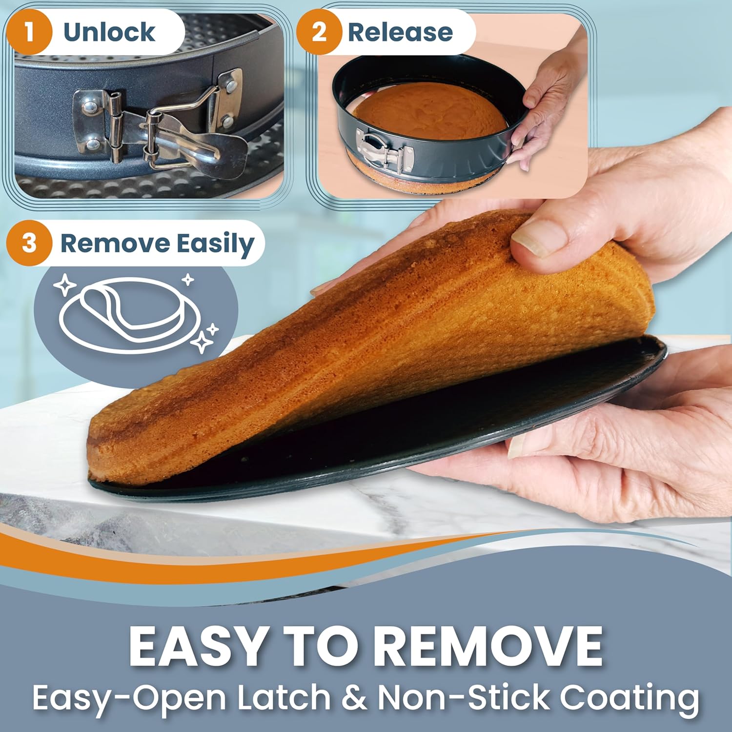 - EASY CAKE REMOVAL – NO PARCHMENT PAPER, NO MESS – No more flouring, parchment, or frustrating releases-just unlatch and lift. These spring pans for baking cheesecake have a smooth non-stick surface for easy release and flawless results. Hand washing recommended.