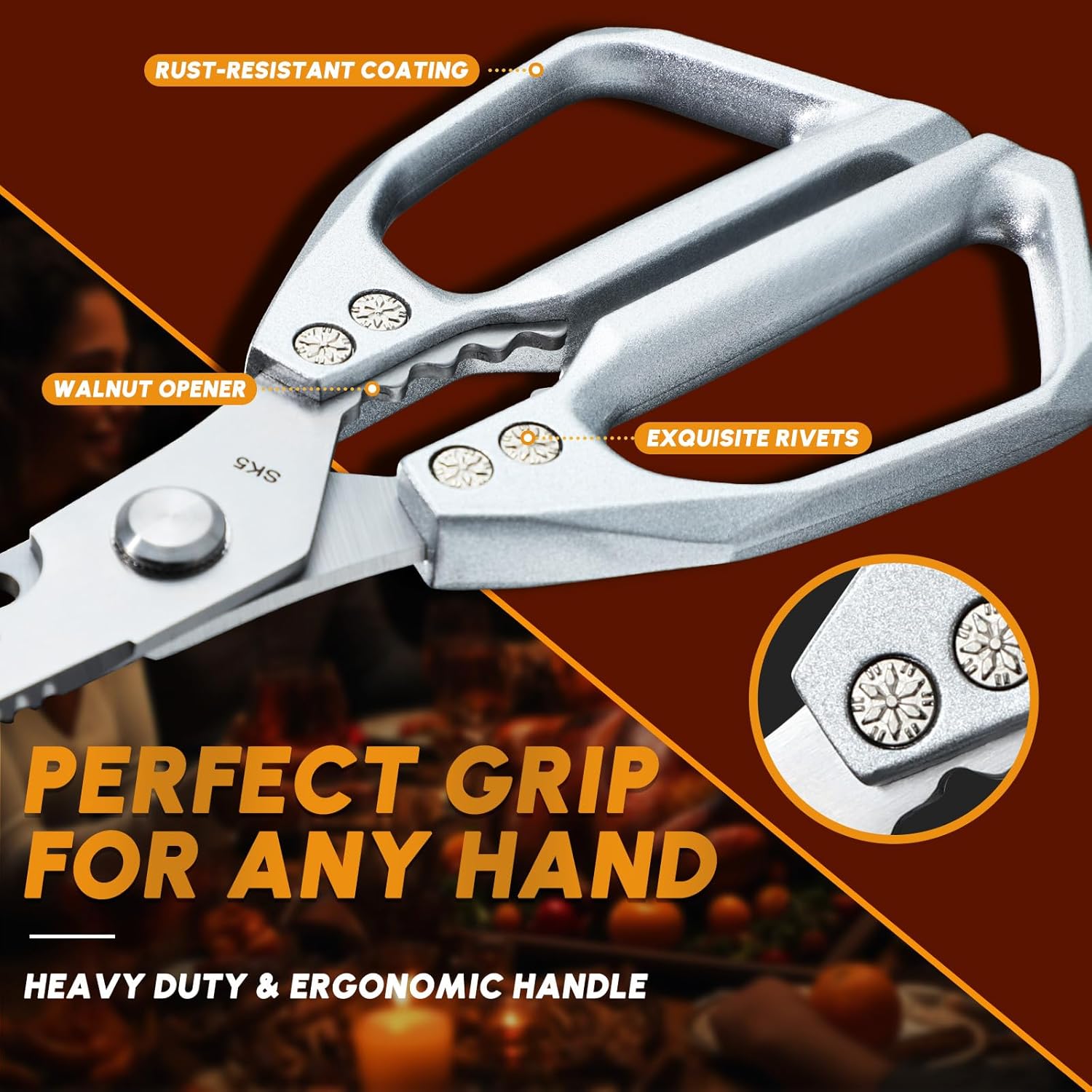 - Two Color Options--This cooking shear set includes one silver and one black kitchen shear. The silver kitchen scissor offers a classic and elegant appearance, perfect for any kitchen setting, while the black turkey shear adds a modern and sleek touch, elevating your culinary experience with its sophisticated look. Choose the color that best matches your kitchen style and needs.