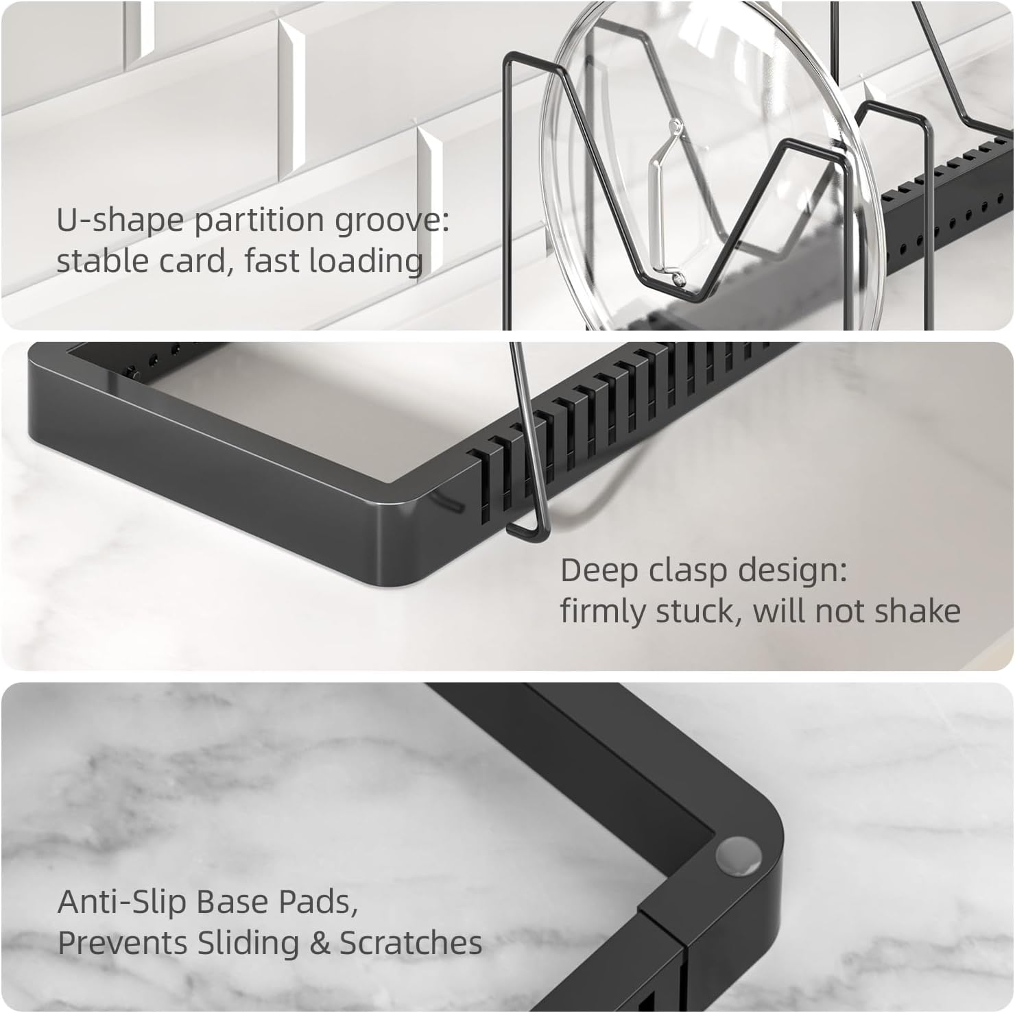 - Customizable Adjustable Dividers: 10 adjustable dividers pot lid holders let you customize spacing for any cookware. The deep U-groove ensures pan lid organizer stability, making it a smarter lid organizers inside cabinet and pan rack organizer system