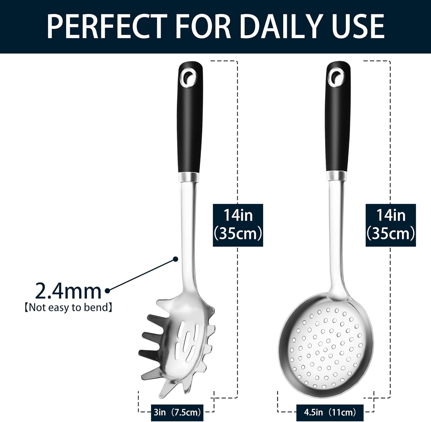 - HEAVY DUTY COOKING UTENSIL SET - This stainless steel cooking spoon set includes a pasta server and a slotted spoon/skimmer. They have thick and long handle and good heat insulation. That makes us feel comfortable to use them, and they won't bend easily.